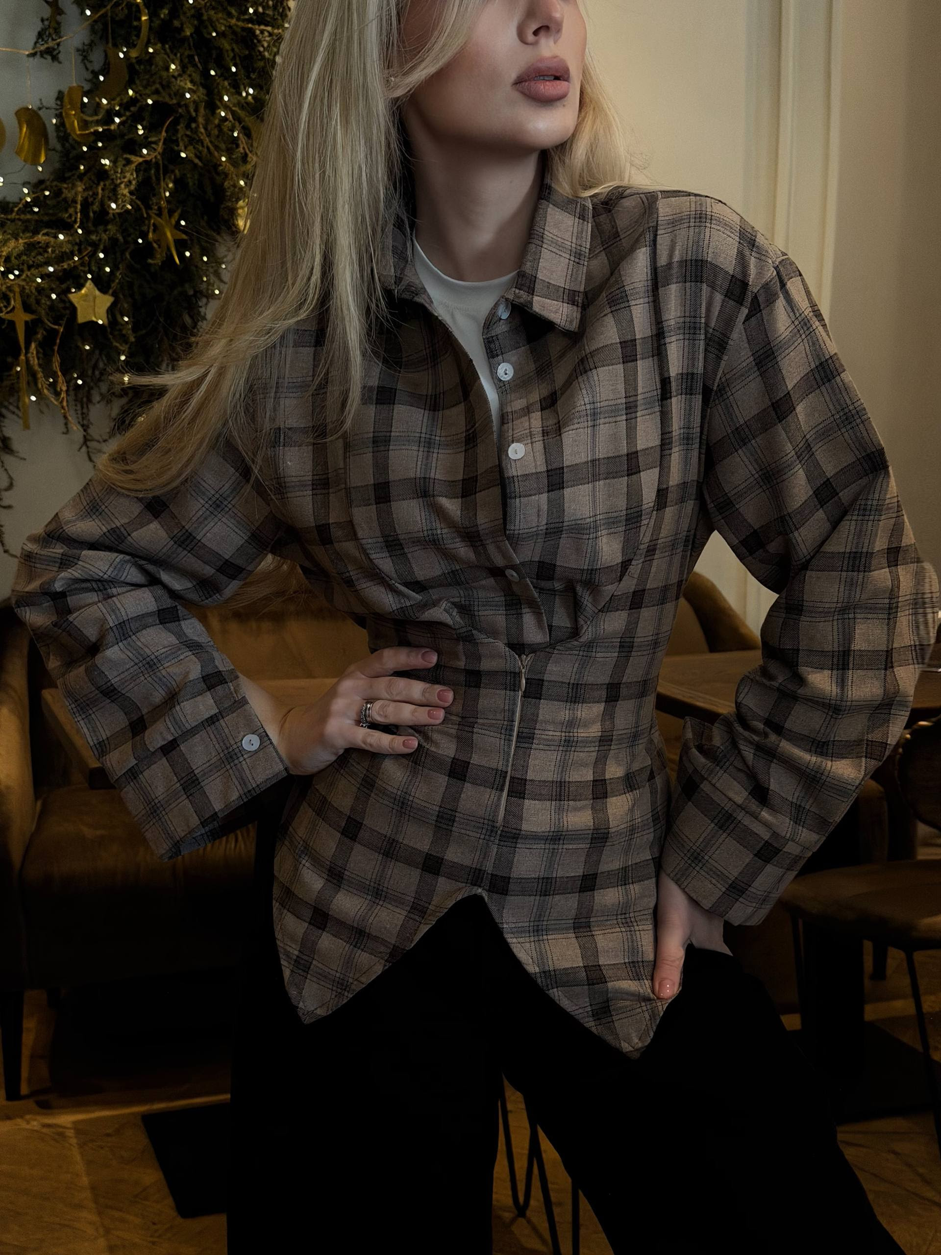 Приталена сорочка cпереду ґудзики та прихованій блискавці ззаду завʼязки регулювати талію фланель в клітинку 2101
