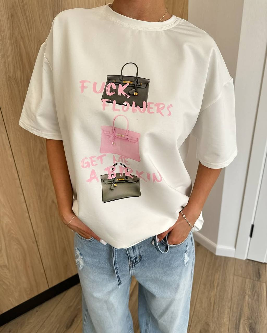 Жіноча біла футболка оверсайз кулір (Cotton 90% ) Fuck flowers 805