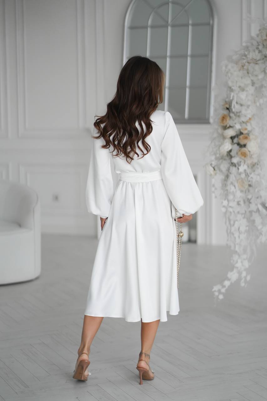 Довгі рукави з манжетами надають образу ніжності, а струмлива тканина красиво грає на світлі, створюючи ефект дорогоцінного шовку.