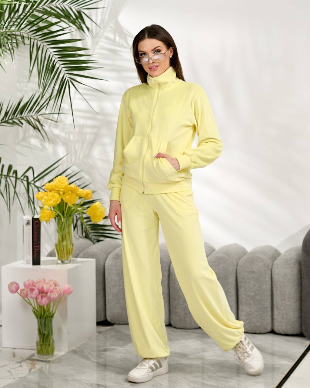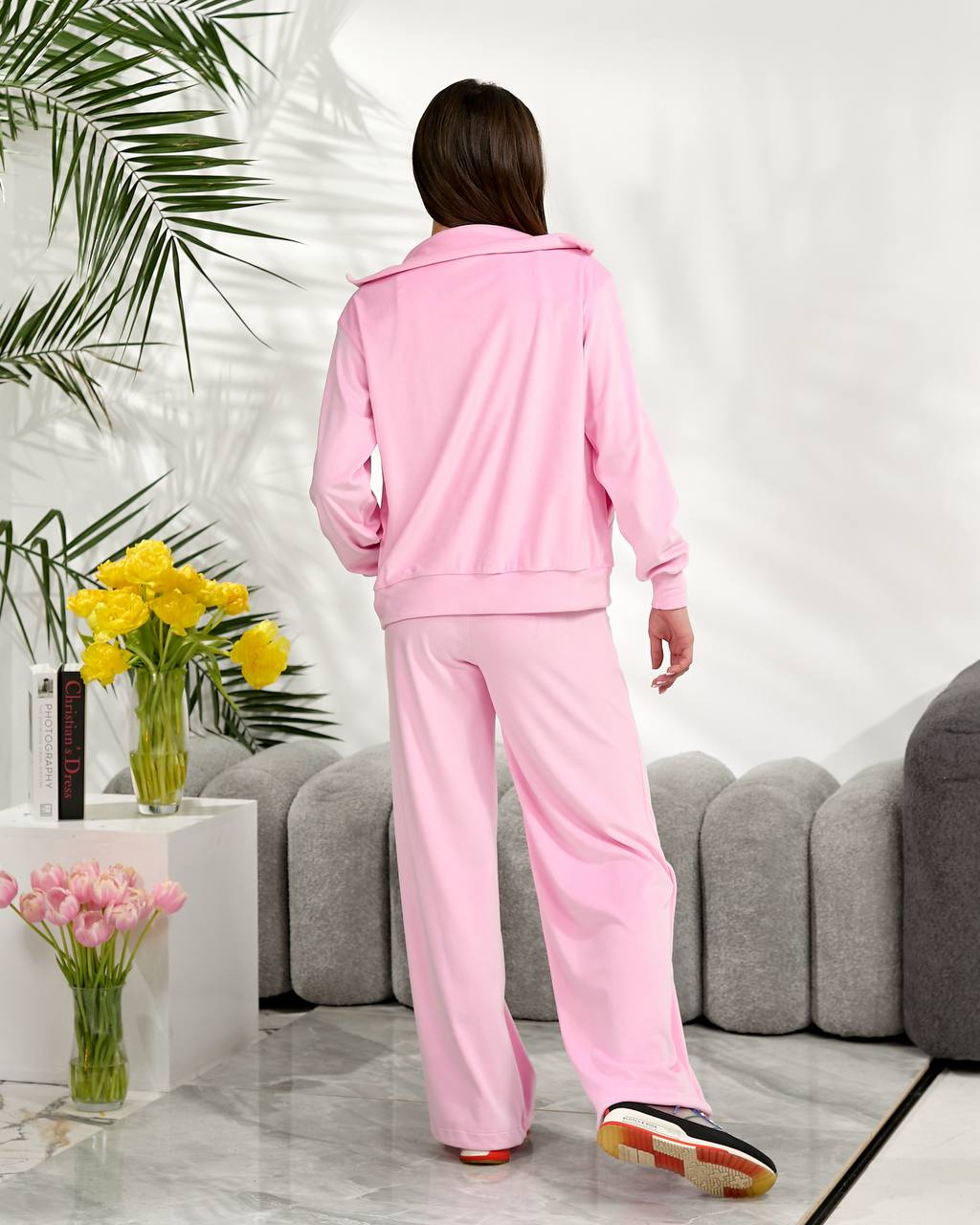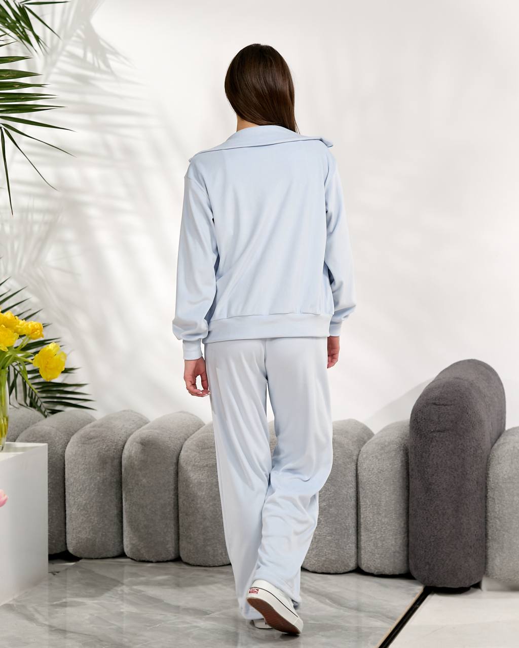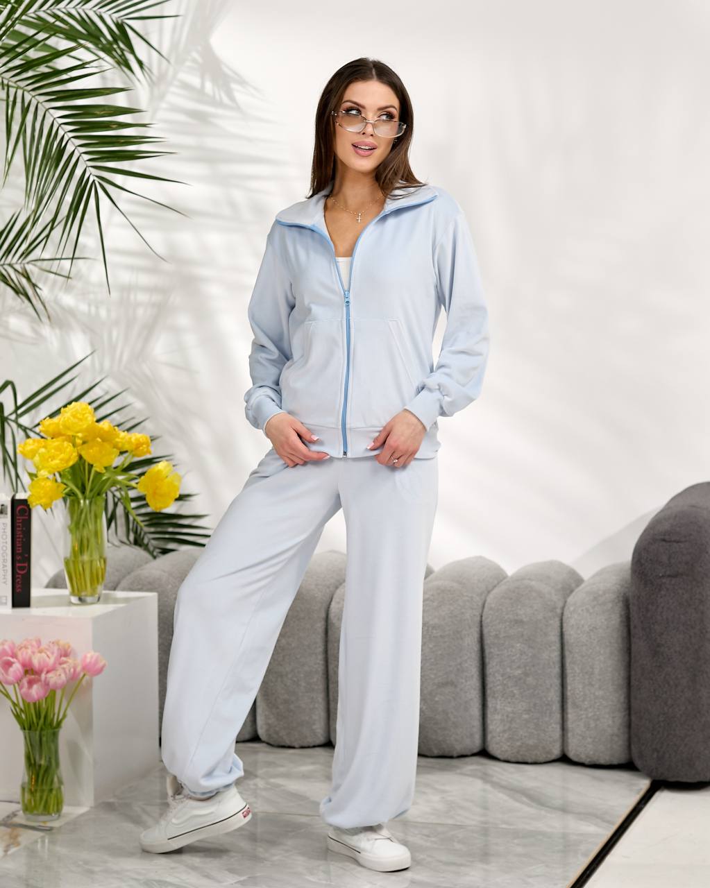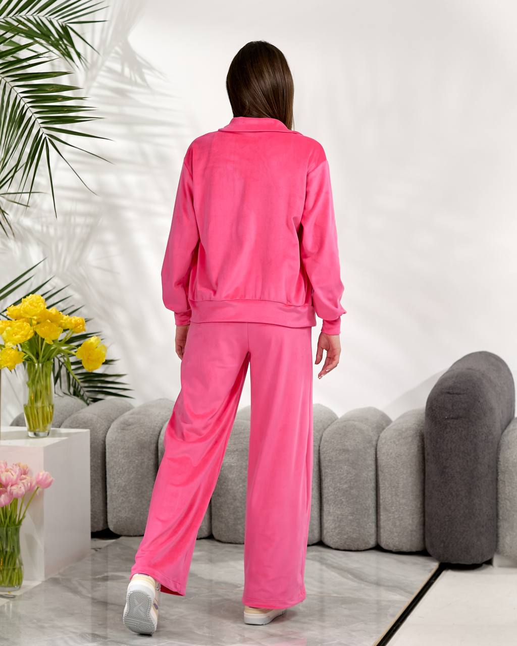 Базовий велюровий костюм складається зі зручної кофти на блискавці з коміром-стійкою та вільних штанів середньої посадки, внизу манжет регулюється резинкою. Ідеальний комплект — для прогулянок, подорожей чи затишних днів вдома.