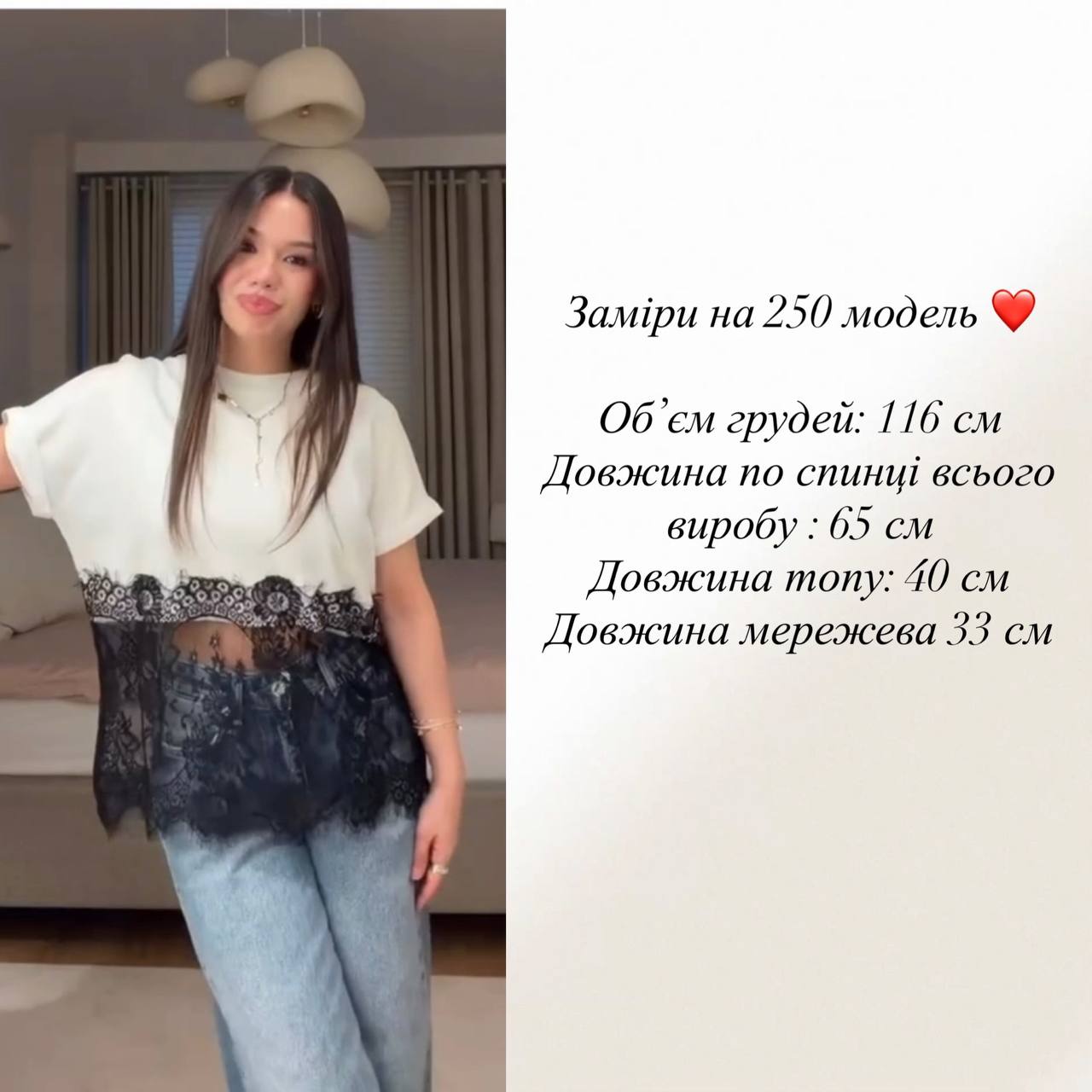 Біла футболка вільного крою з акцентною чорною мереживною вставкою по низу.