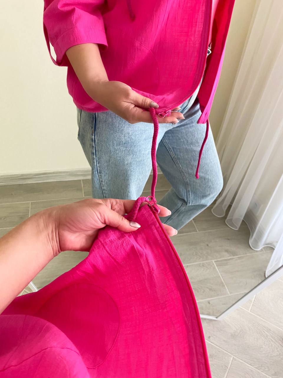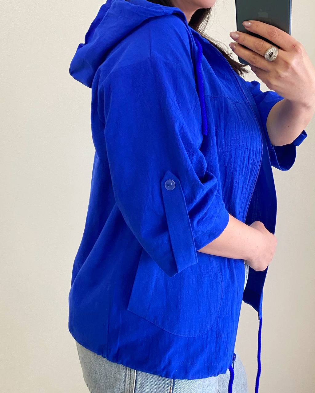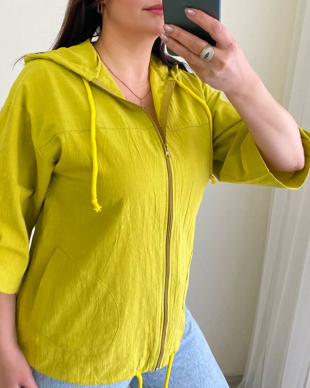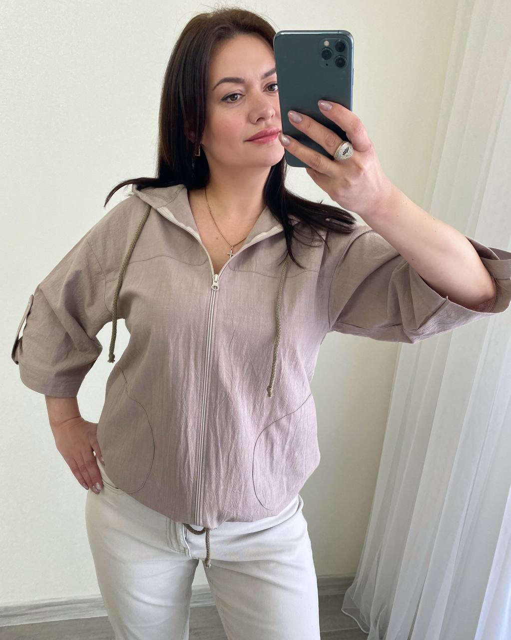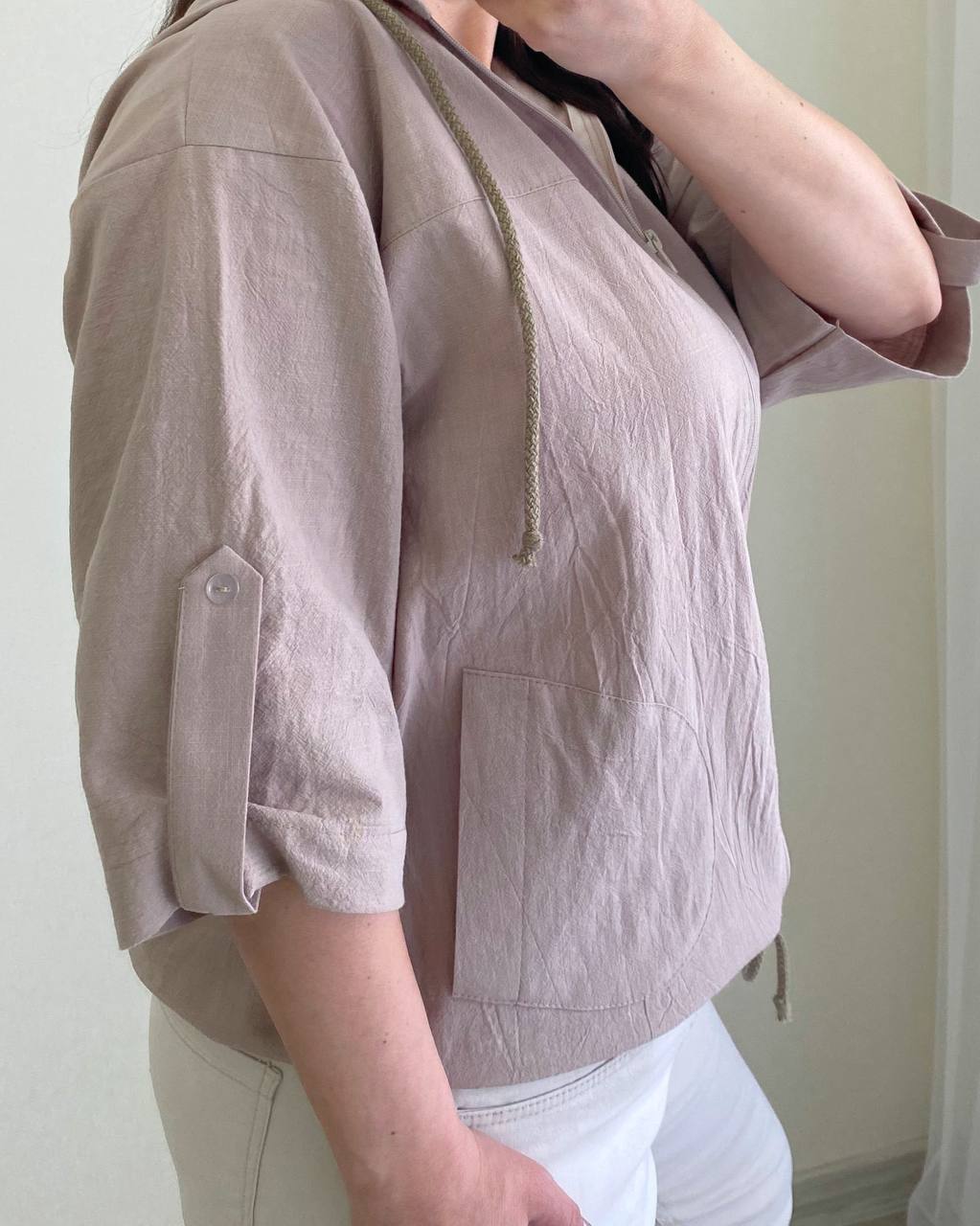 Блуза із дуже класної мʼякої натуральної тканини на блискавці, із капюшоном та кишенями. Рукав застібається на ґудзик. В капюшоні та по низу блузи є канати.