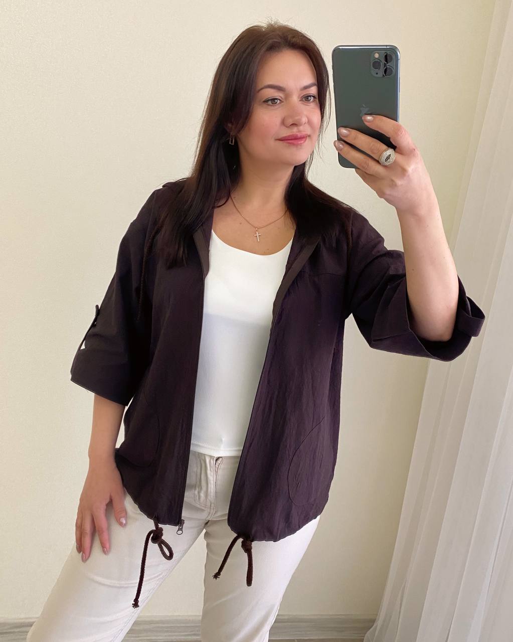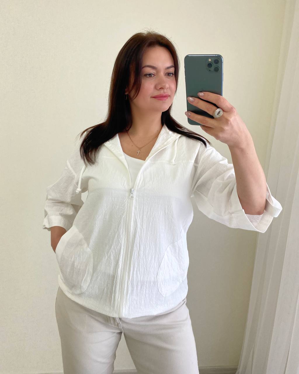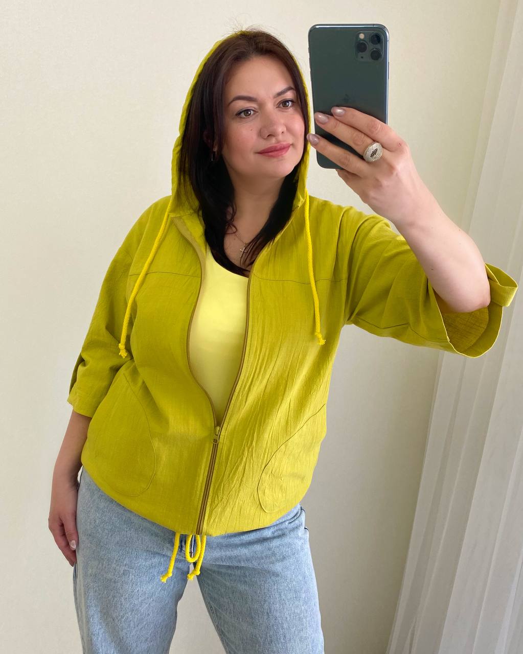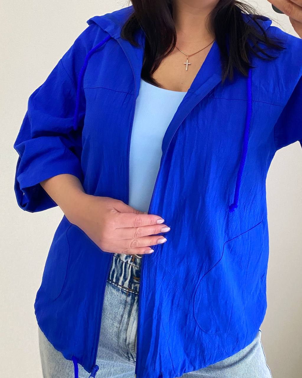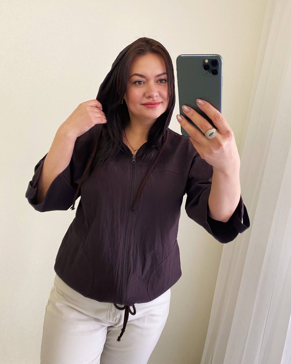 Блуза із дуже класної мʼякої натуральної тканини на блискавці, із капюшоном та кишенями. Рукав застібається на ґудзик. В капюшоні та по низу блузи є канати.