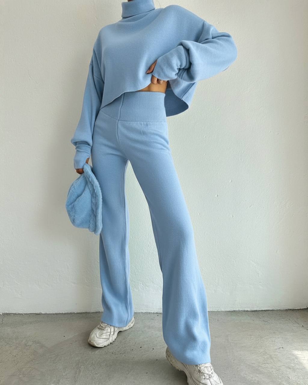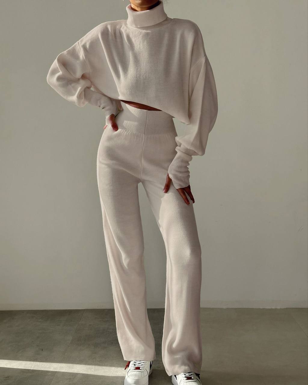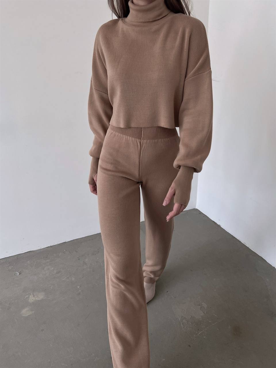 Справді цікавий та теплий костюмчик, штани на дуже високій посадці, вкорочена кофта з рукавчиками, в яких є прорізи для пальчиків. Тепло та стильно