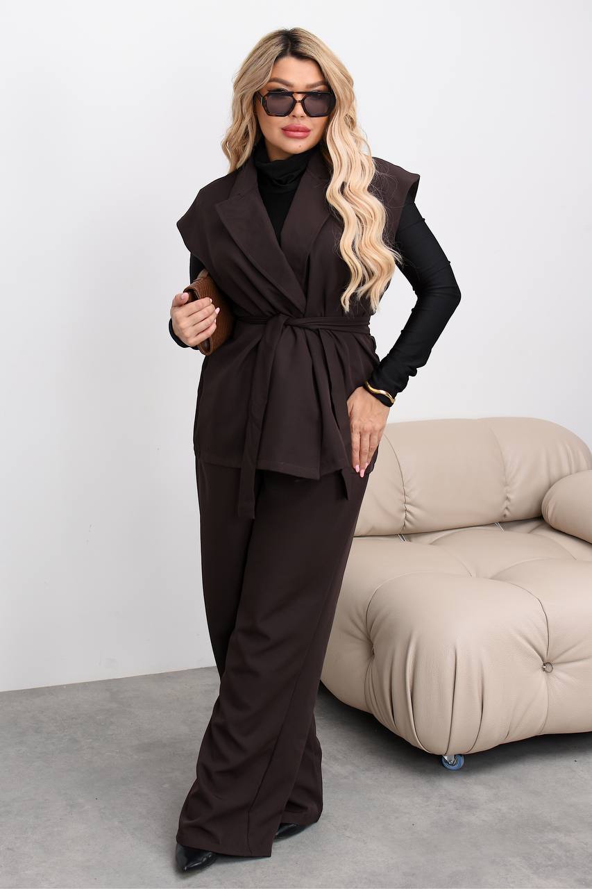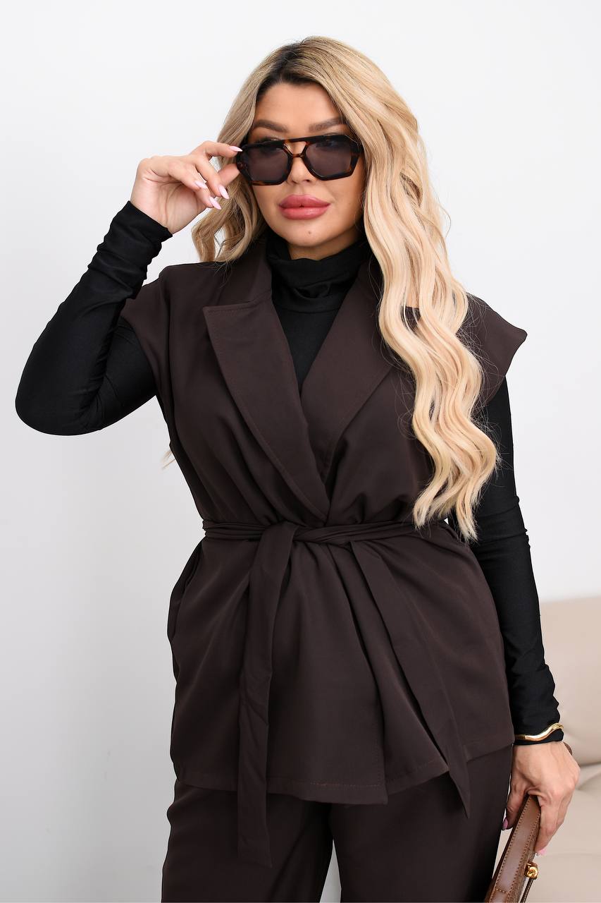 Елегантний костюм-двійка з костюмної тканини – вибір для жінок, які цінують комфорт та стиль. Прямі штани візуально витягають силует, а подовжений жилет з англійським коміром надає образу витонченості. Модель на запах із поясом акцентує талію, створюючи жіночний силует. Ідеальний як для ділових зустрічей, так і для стильних прогулянок містом.