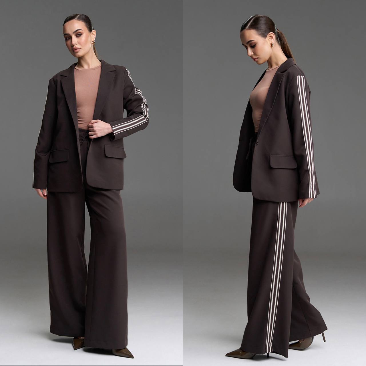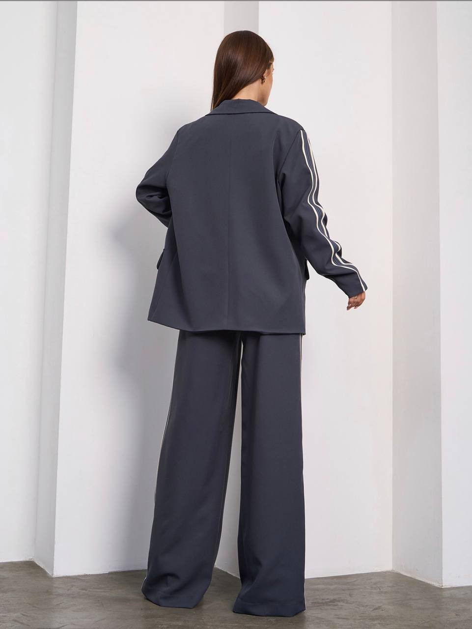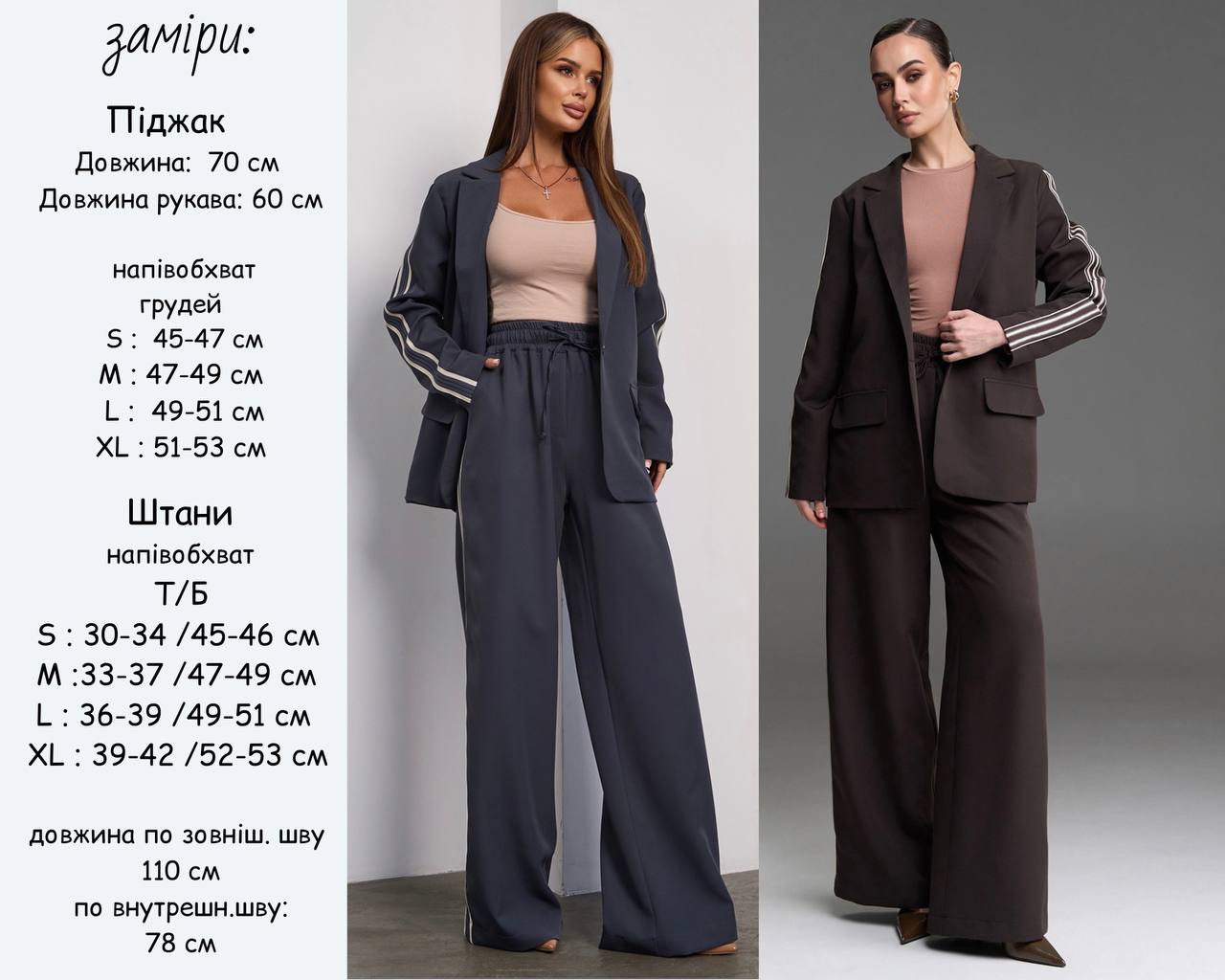 Опис: Стильний костюм із декоративними лампасами. Піджак з підкладом,брюки вільного крою із кишенями, також декоровані лампасами. Брюки з високою посадкою та широкою поясною гумкою .