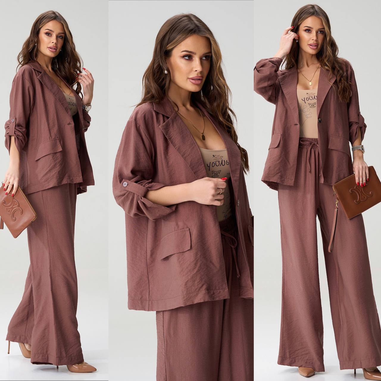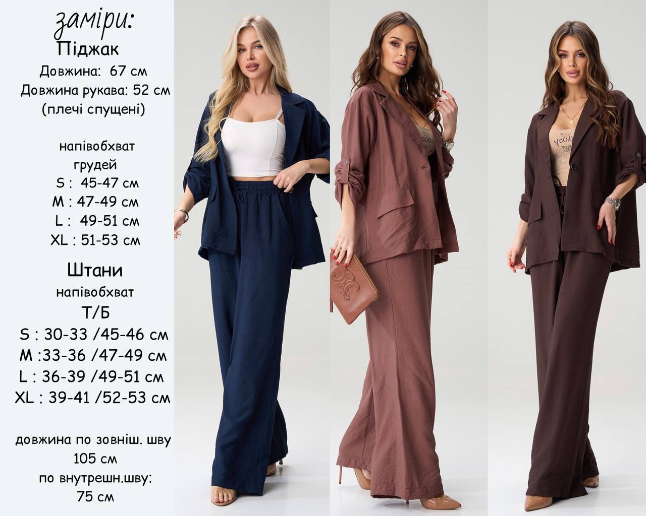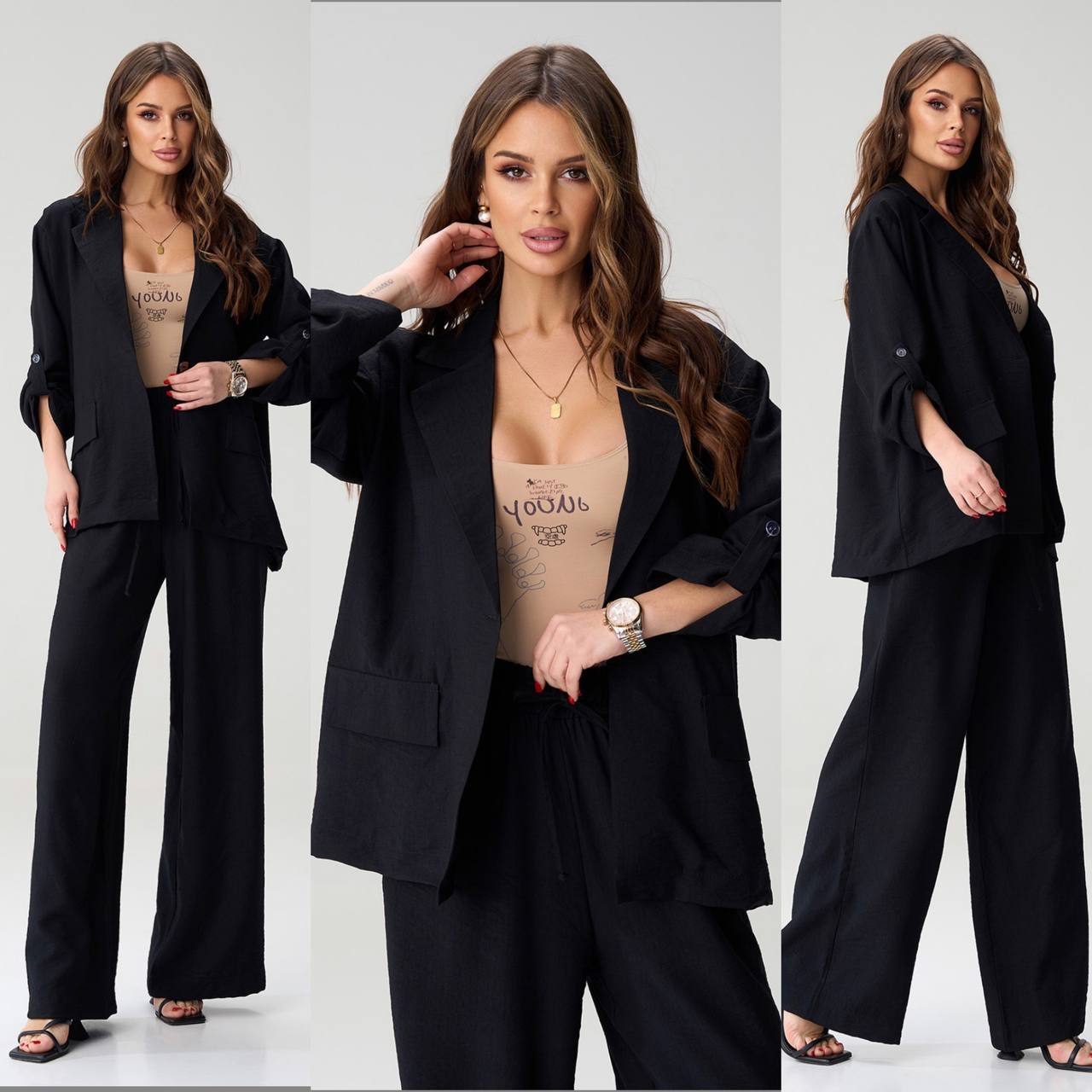 Опис: Вільний костюм-двійка виготовлений із льону. Піджак без підкладки, довжина рукава регулюється.Брюки вільного крою з високою посадкою та кишенями.