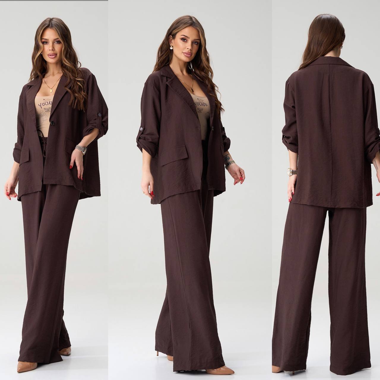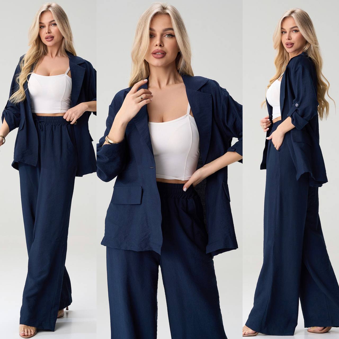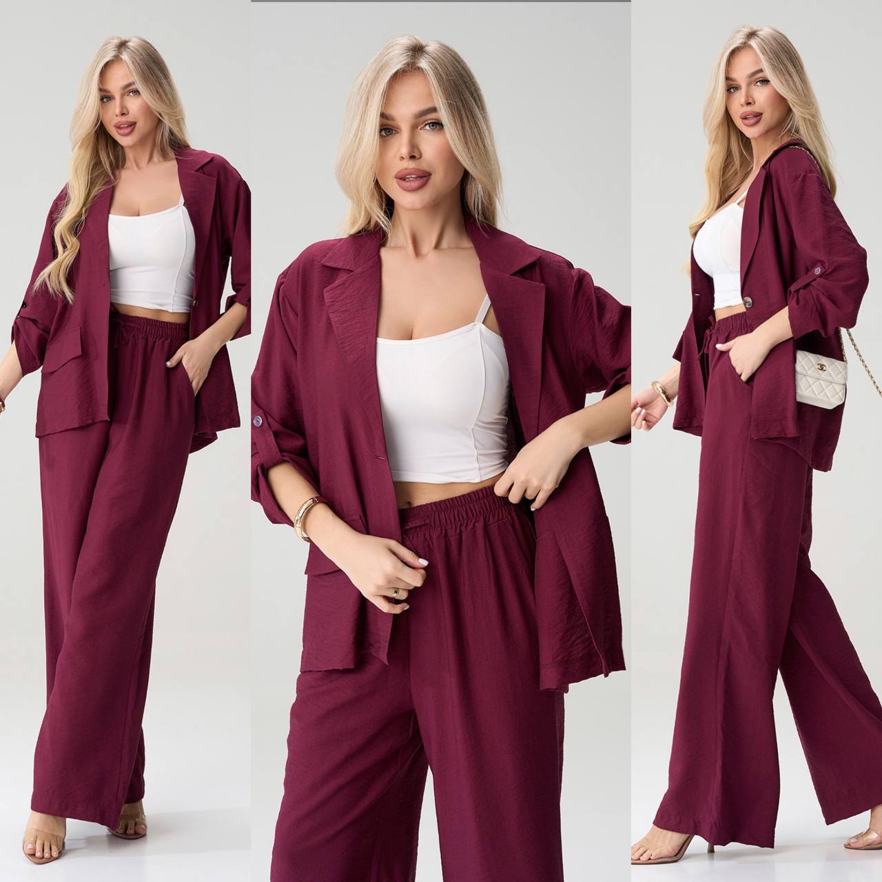 Опис: Вільний костюм-двійка виготовлений із льону. Піджак без підкладки, довжина рукава регулюється.Брюки вільного крою з високою посадкою та кишенями.
