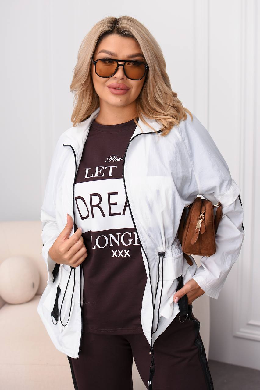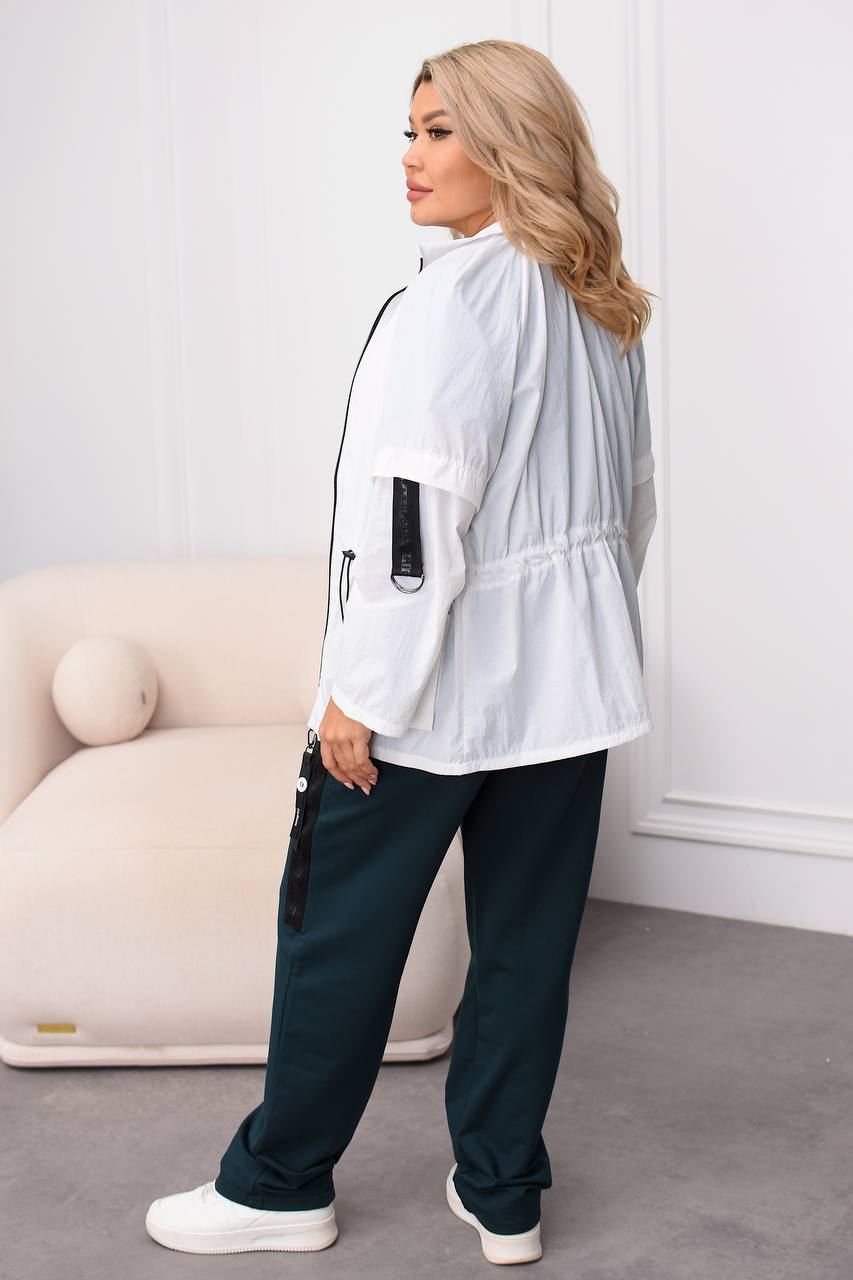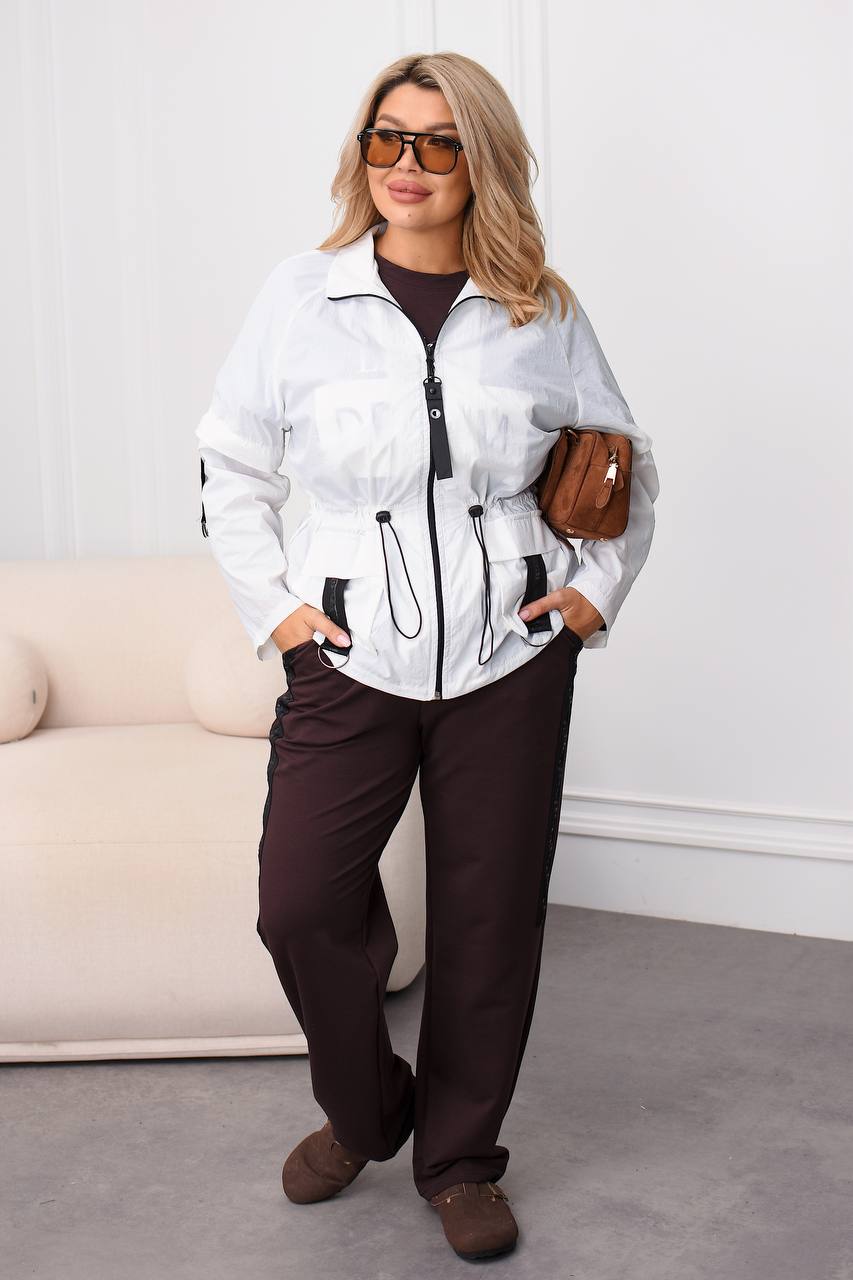 Вітровка на молнії з карабіном , з боків кишені з клапанами та лампасами з напівкільцями , талія на резинці з фіксаторами , можна регулювати обʼєм талії. На рукавах лампаси з регуляторами довжини . Костюм : кофта з коротким рукавом , на грудях якісний накат , штани з боків лампаси , на резинці з боків кишені .