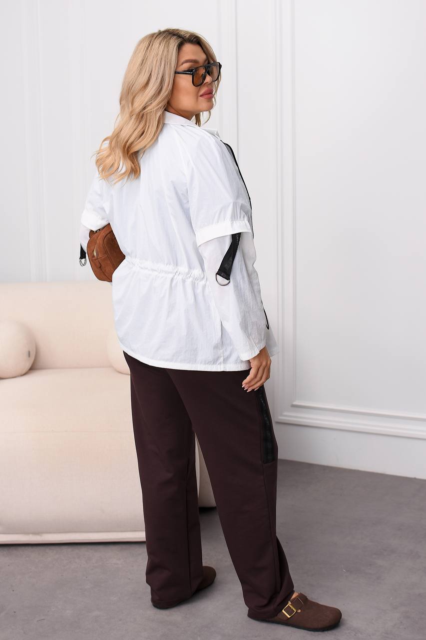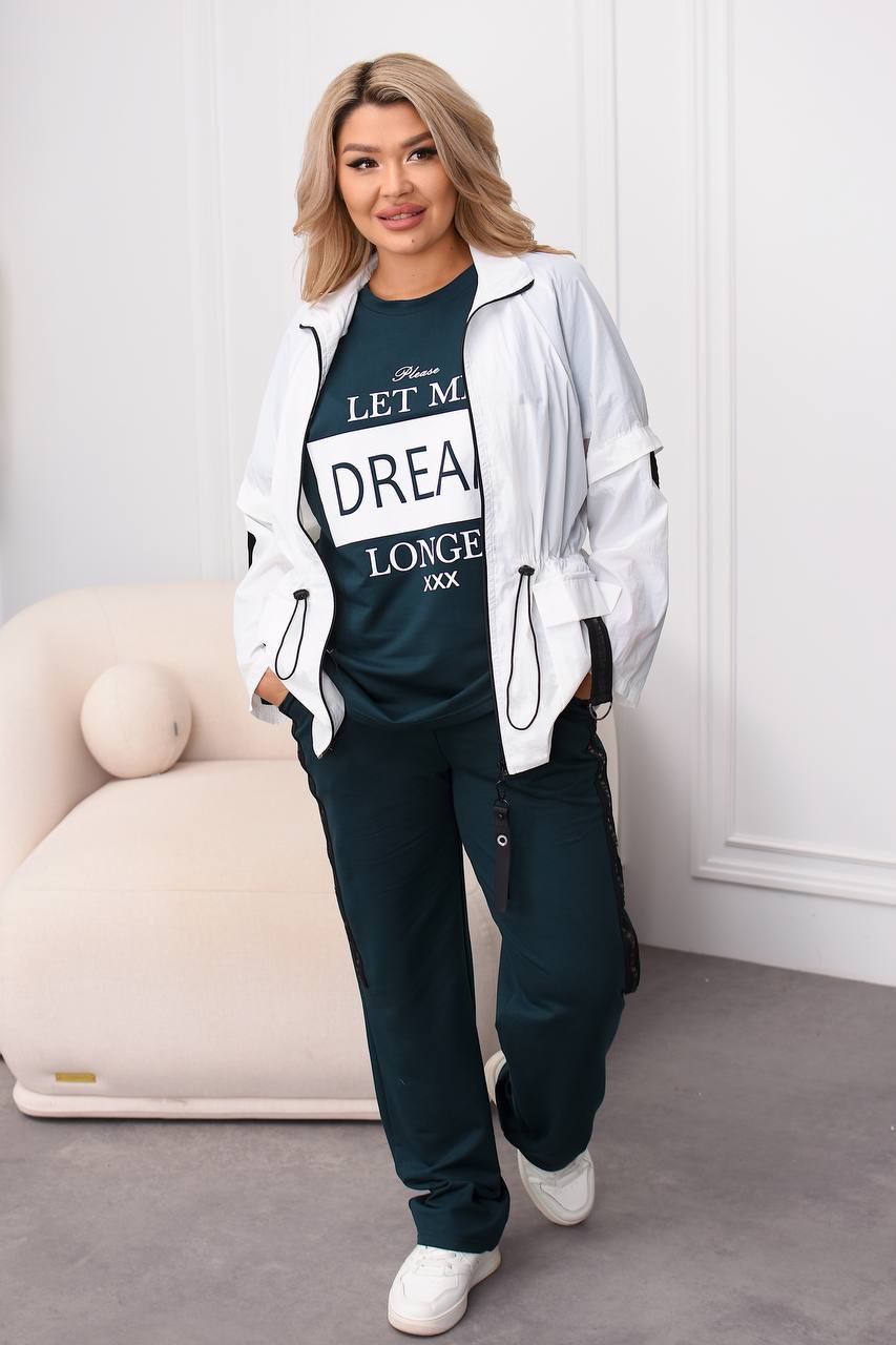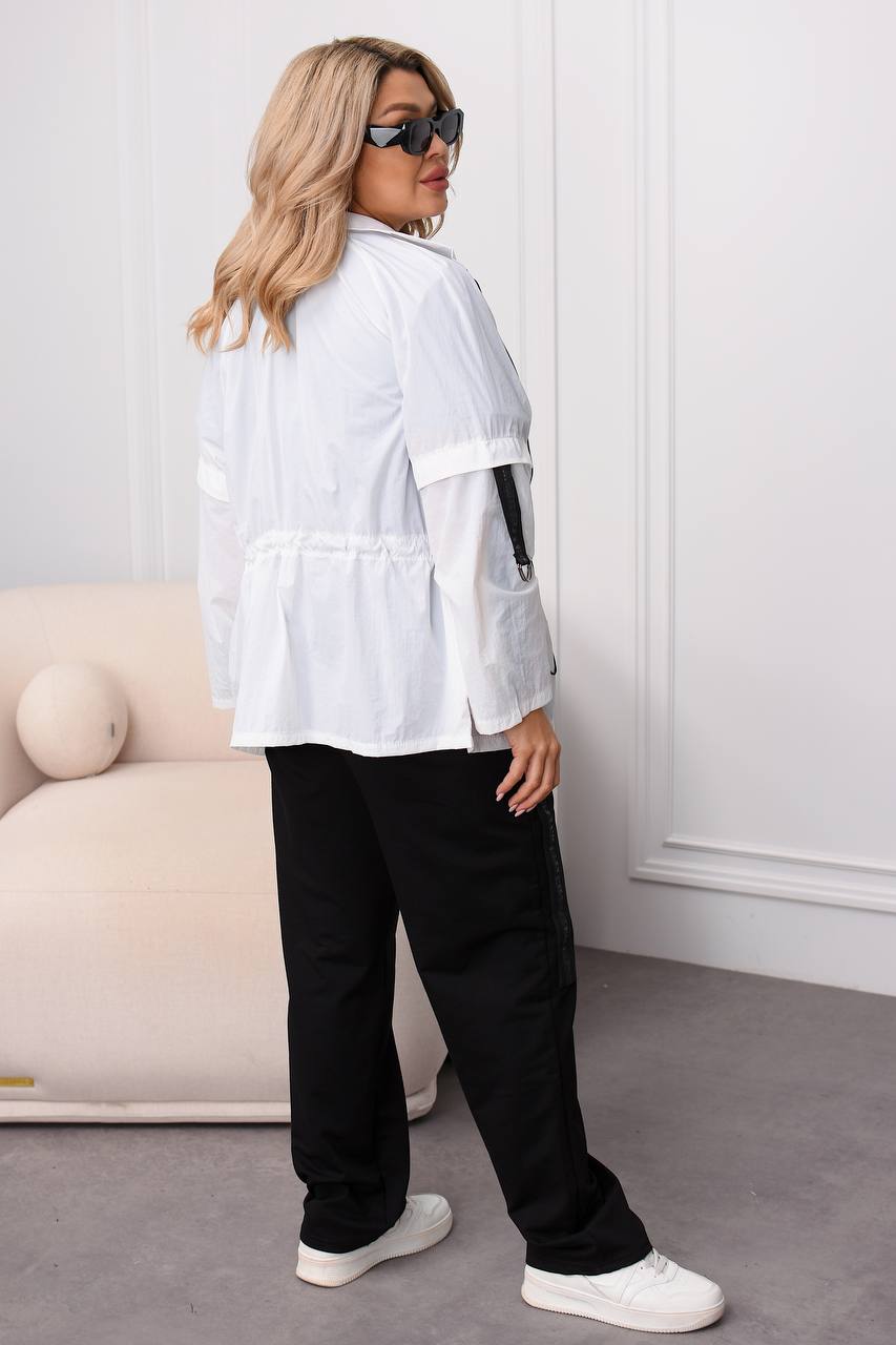 Вітровка на молнії з карабіном , з боків кишені з клапанами та лампасами з напівкільцями , талія на резинці з фіксаторами , можна регулювати обʼєм талії. На рукавах лампаси з регуляторами довжини . Костюм : кофта з коротким рукавом , на грудях якісний накат , штани з боків лампаси , на резинці з боків кишені .