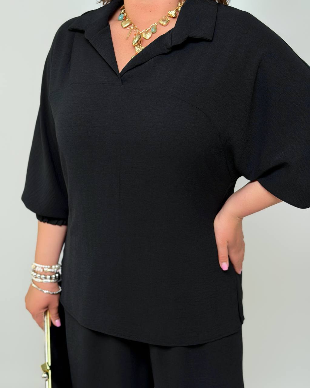 Блуза вільного крою, з відкладним сорочкового типу з м’яким відкритим вирізом, рукав 3/4 , об’ємний, зібраний на резинку. Витончена кокетка по лінії грудей красиво підкреслює верх та створює м’яку, жіночну лінію силуету і робить фігуру більш зібраною.