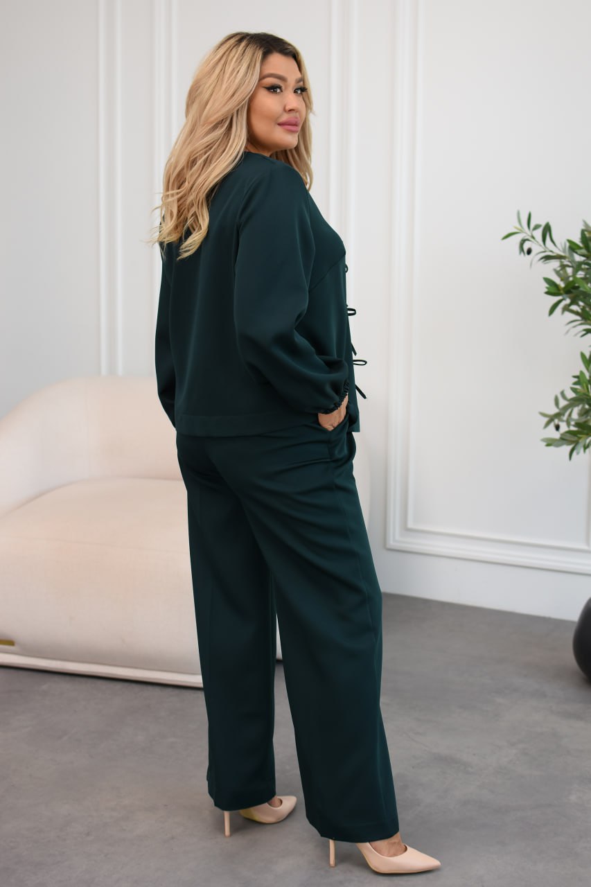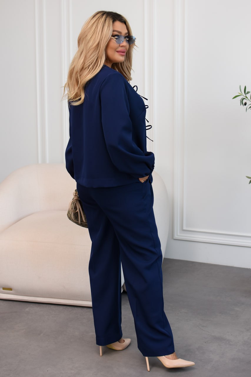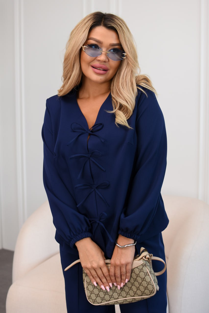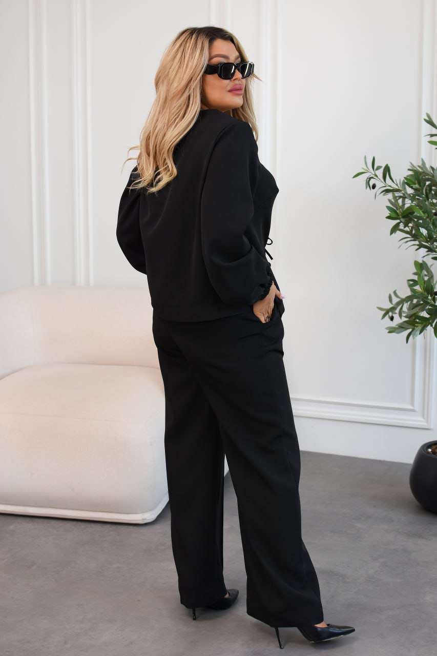 Стильний брючний костюм, який однаково доречний і в офісі, і на особливих подіях. Жакет вільного крою з декоративними застібками-бантиками додає образу елегантності, під верхнім бантом — робочий гудзик. Штани із середньою посадкою та еластичною резинкою ззаду на поясі дарують комфорт щодня.