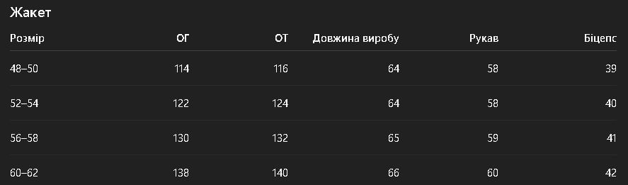 Жакет: Обхват грудей – 122 см, обхват талії – 124 см, довжина – 64 см, рукав – 58 см, біцепс – 40 см