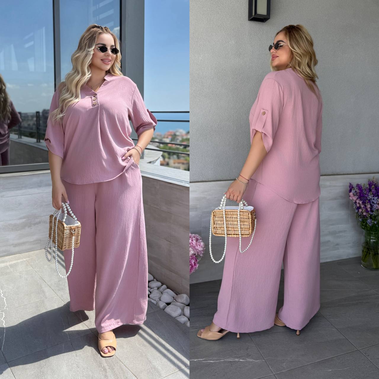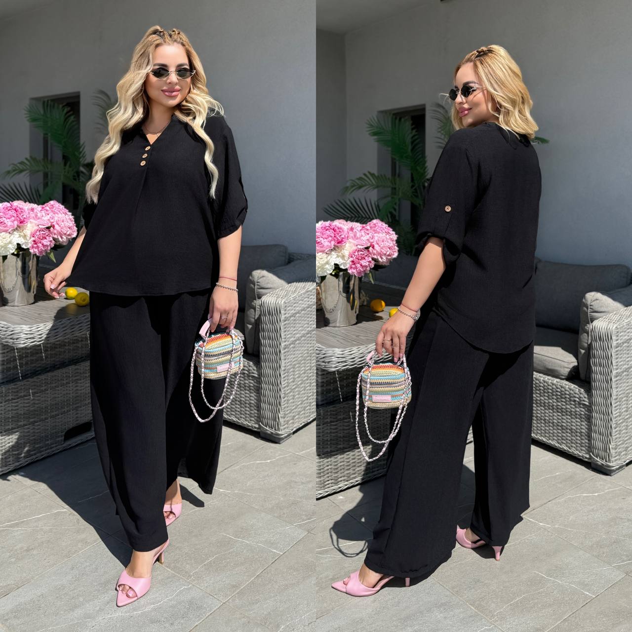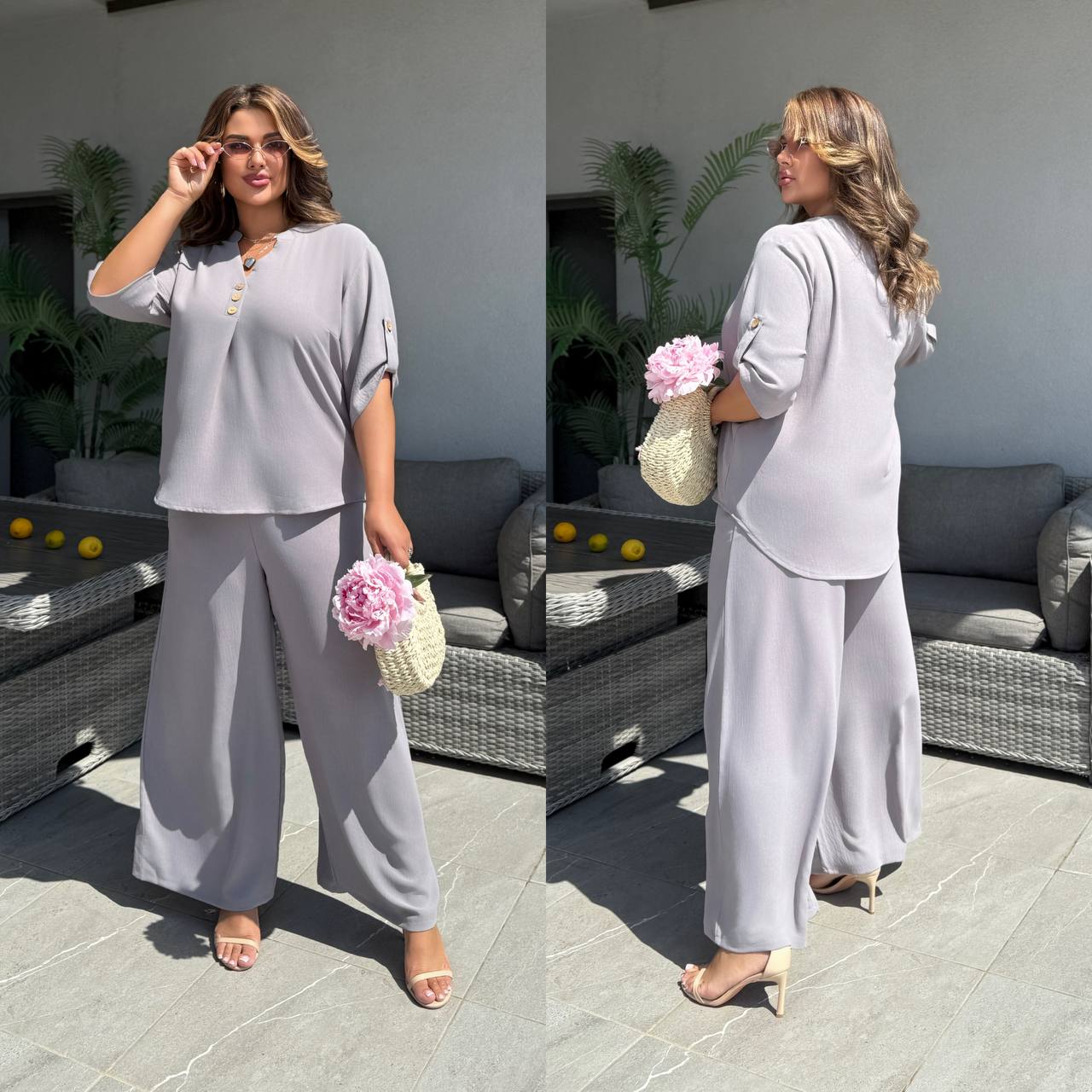 Штани палаццо вільного крою мають бічні кишені та резинку на талії, футболка вільного крою декорована ґудзиками, довжина рукава регулюється