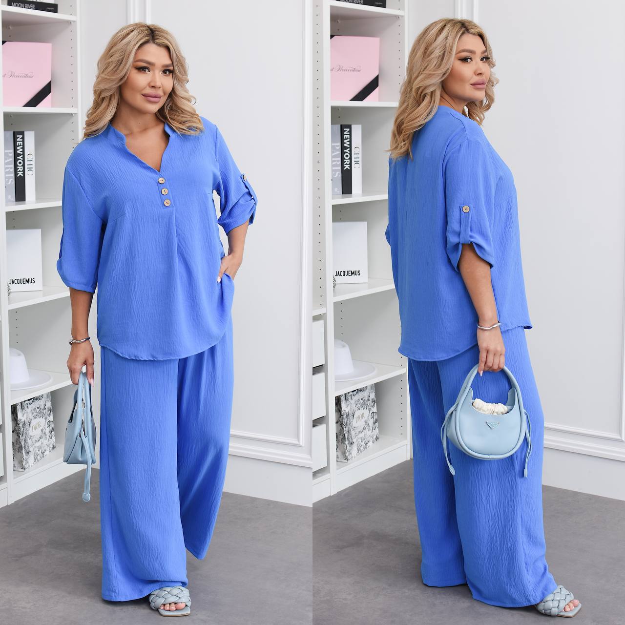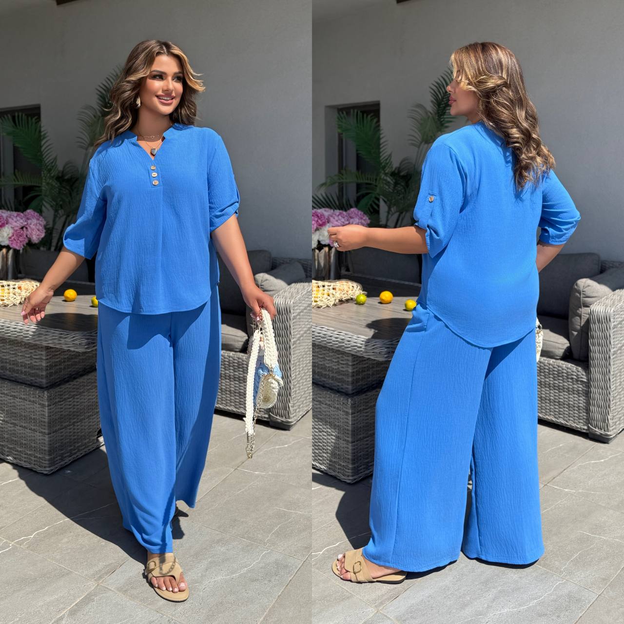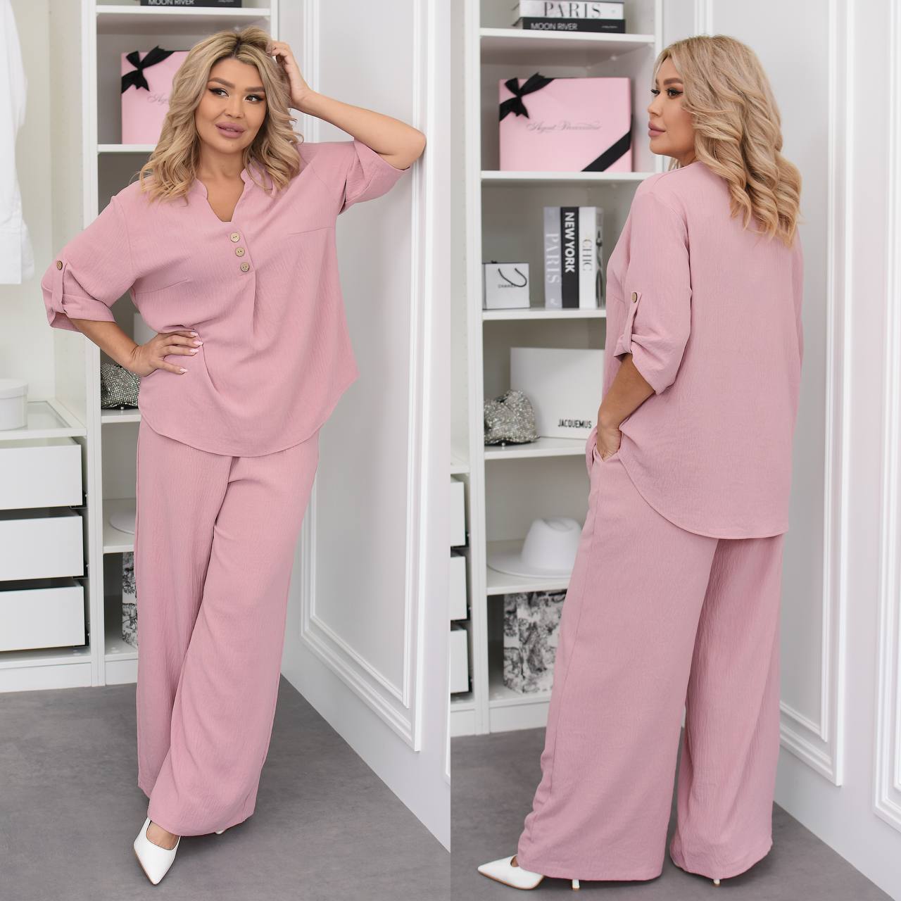 Штани палаццо вільного крою мають бічні кишені та резинку на талії, футболка вільного крою декорована ґудзиками, довжина рукава регулюється