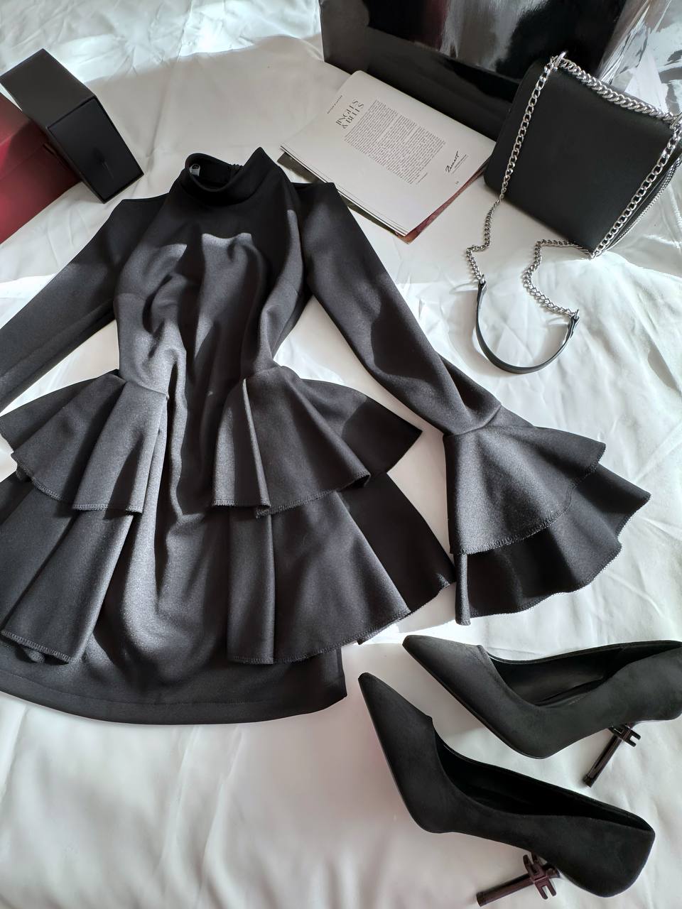 Чорна сукня з вишуканими воланами на рукавах і декоративною баскою створює розкішний, жіночний силует, у якому неможливо залишитися непоміченою. Воротник-стійка додає образу елегантності, а потайна змійка ззаду забезпечує ідеальну посадку. Модель виконана з якісного трикотажу Алекс, що комфортно облягає та виглядає дорого.