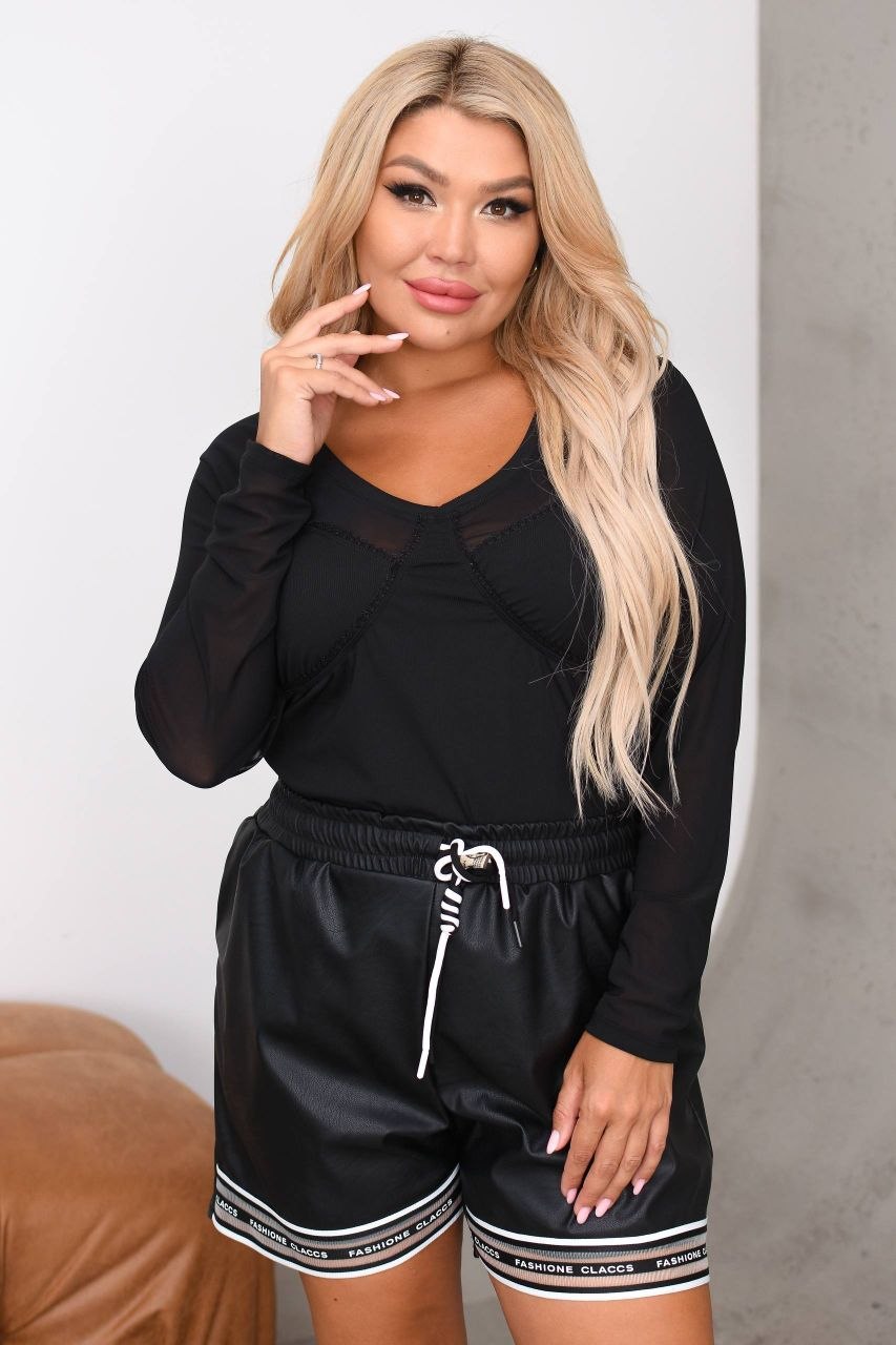Модель №815. Шорти. Шкіряні шорти, з бічними і задніми кишенями, на талії гумка з подвійним шнурком, попереду на манжетах декоративна стрічка. шорт. Тканина трохи розтягується. Тканина шкіра Еко. Колір: Чорний. Розміри: 50-52, 54-56, 58-60