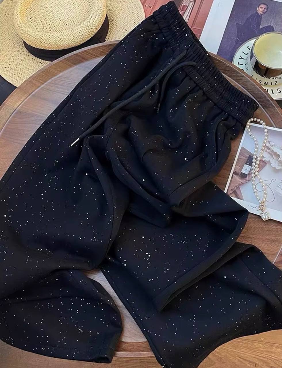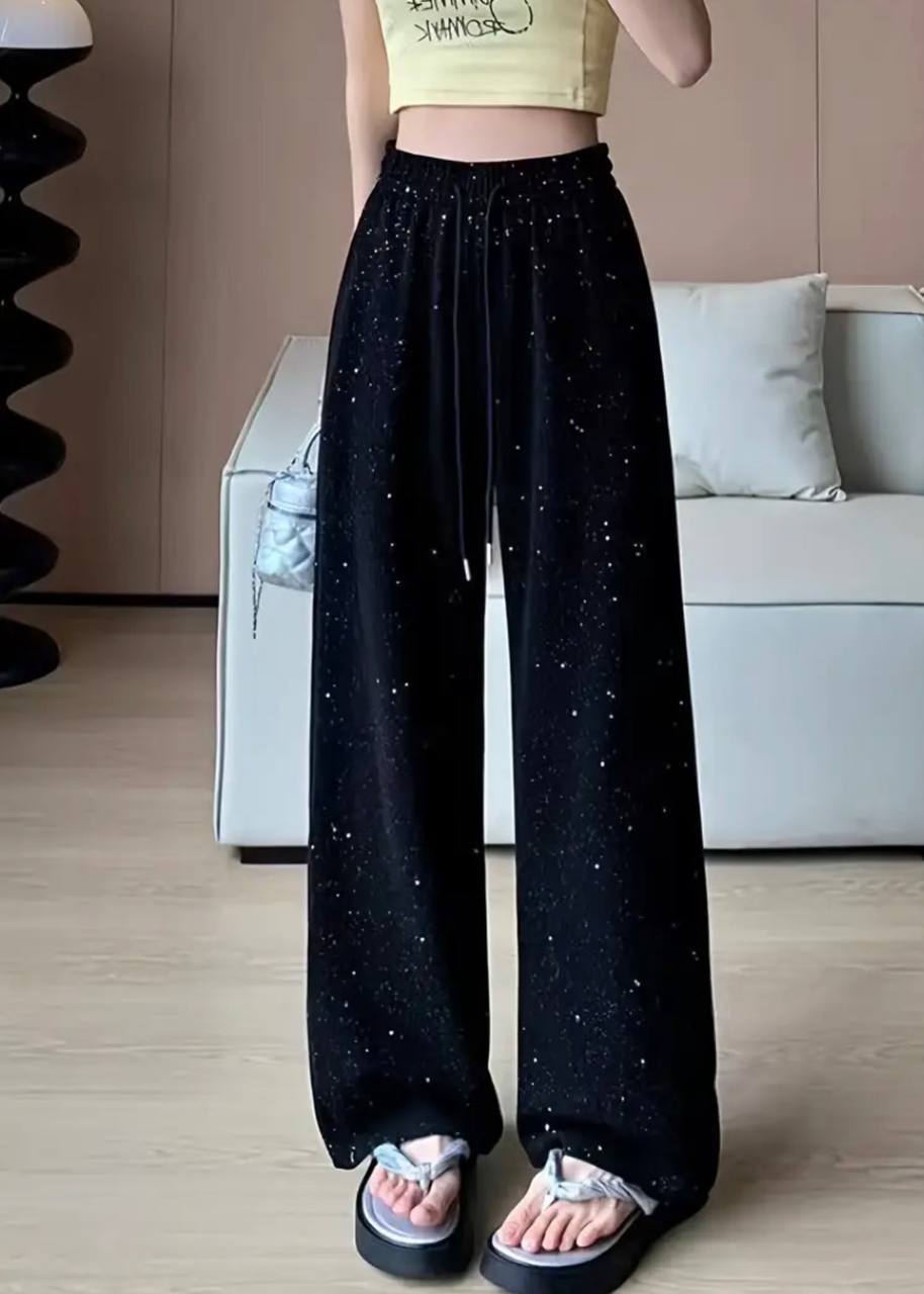 Ефектна модель wide leg, декорована дрібними камінцями, які додають образу блиску та стильного акценту.
