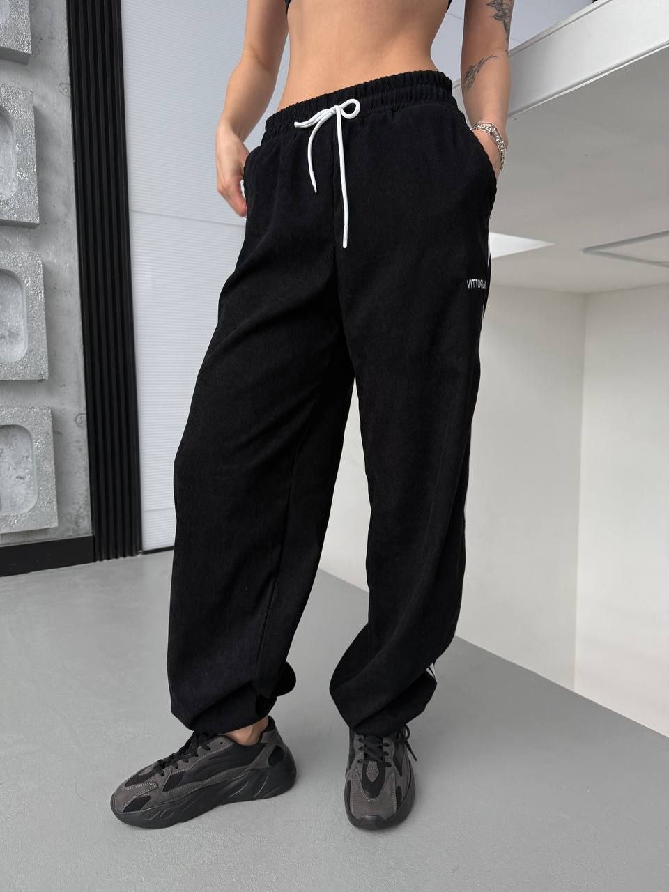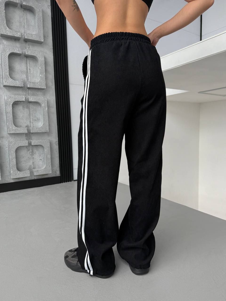 Штани палаццо з лампасами, по низу можна затягнути куліскою. Зручна модель в розмірі oversize. Тканина приємна та мʼяка на дотик