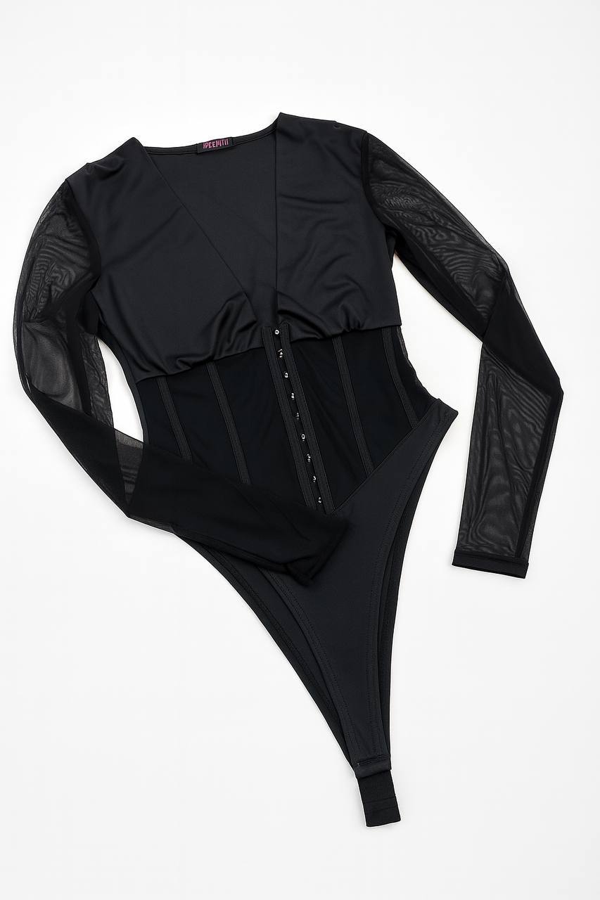 Вишукане чорне боді з напівпрозорими рукавами і сітчастим корсетом. V-виріз створює акцент на зоні декольте, а щільна посадка формує ідеальний силует. Підходить для вечірок та святкових образів.