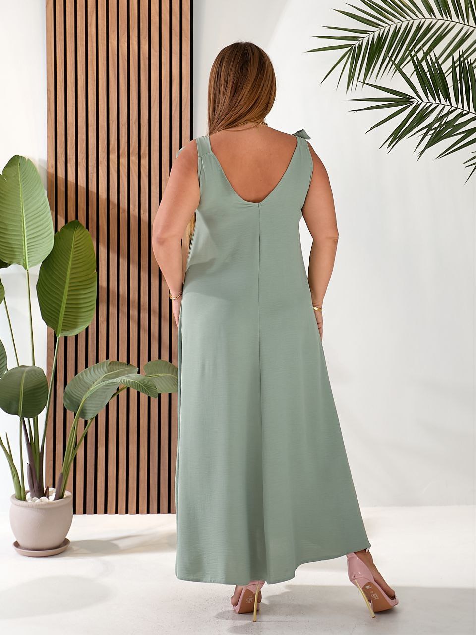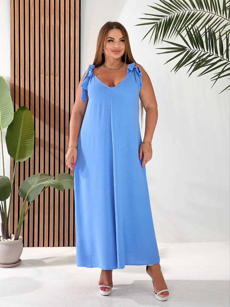Стильна та жіночна сукня максі довжиною, вільного крою – повітряна для літа! Родзинкою сукні є бретели, які зав’язуються на грайливі бантики, тому ви можете регулювати комфортну посадку. Має V-подібний виріз, який додає жіночності образу.