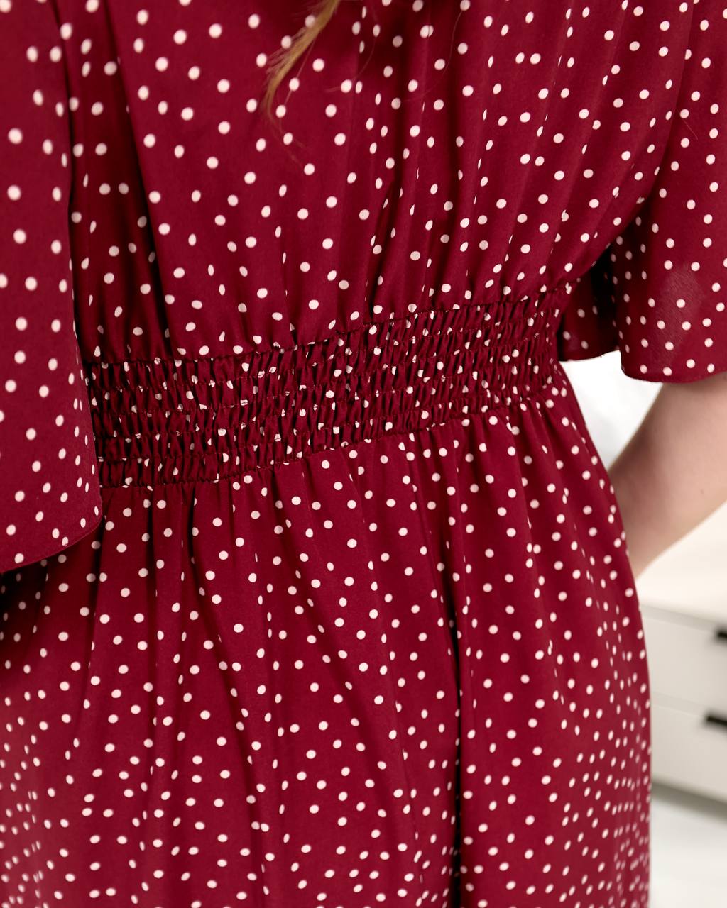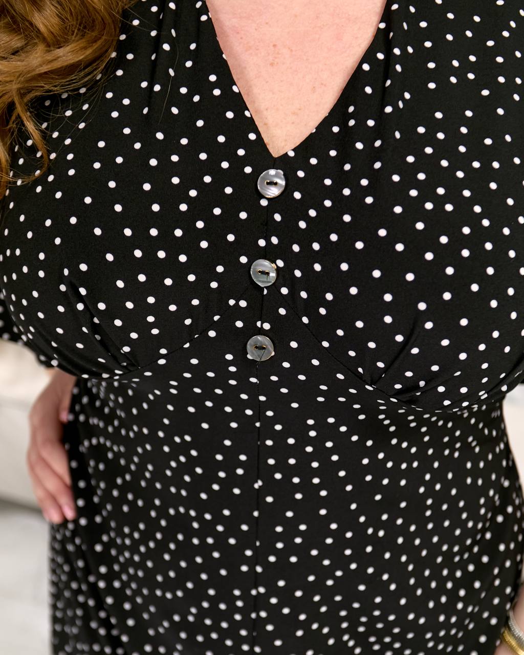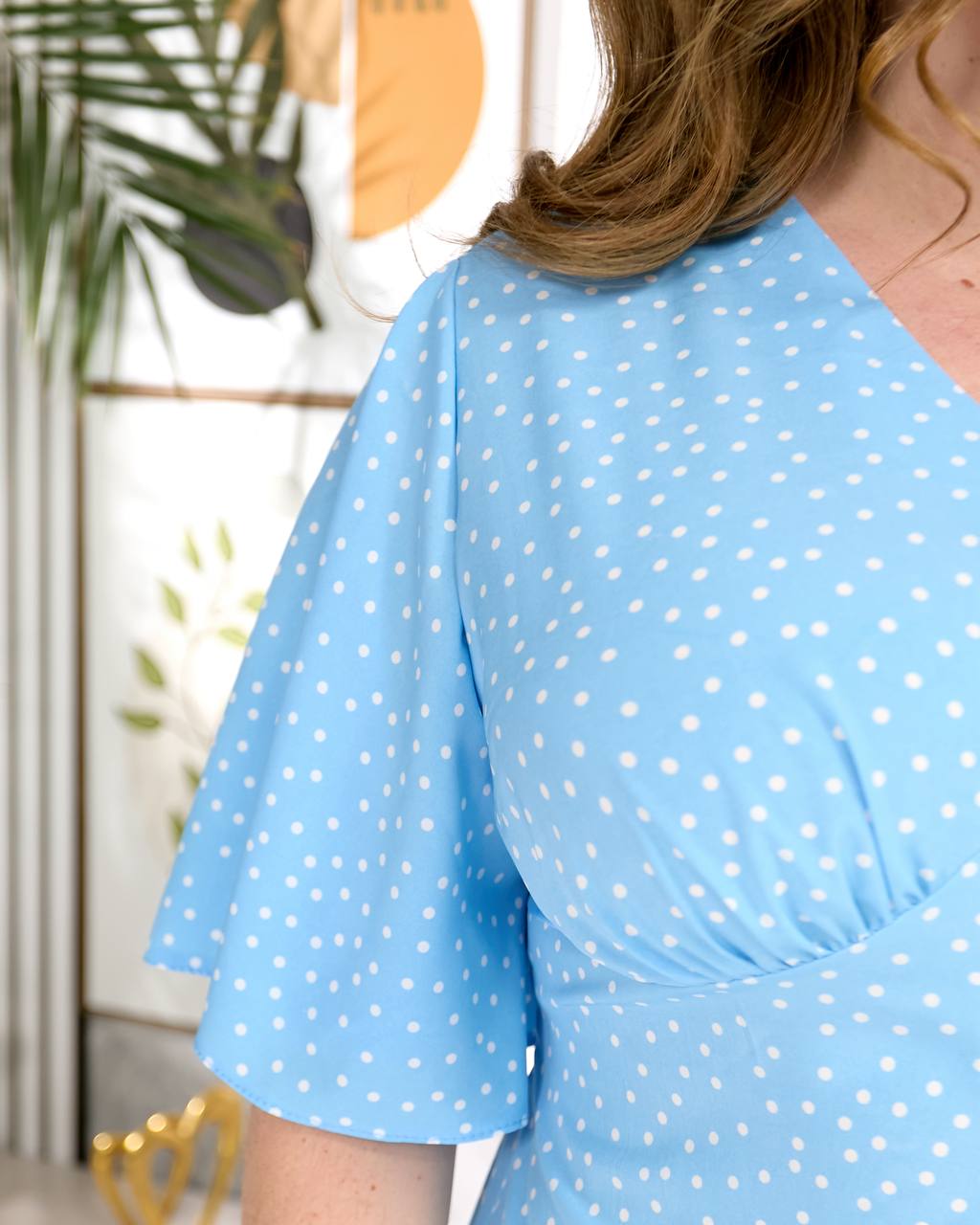 Модель має вільний, комфортний крій, який гарно сідає по фігурі, не обмежуючи рухів. Акуратний V-подібний виріз із декоративними ґудзиками додає жіночності, а рукави з м’яким об’ємом створюють легкий силует. По спинці талію виділяє декілька смужок тонької резинки.