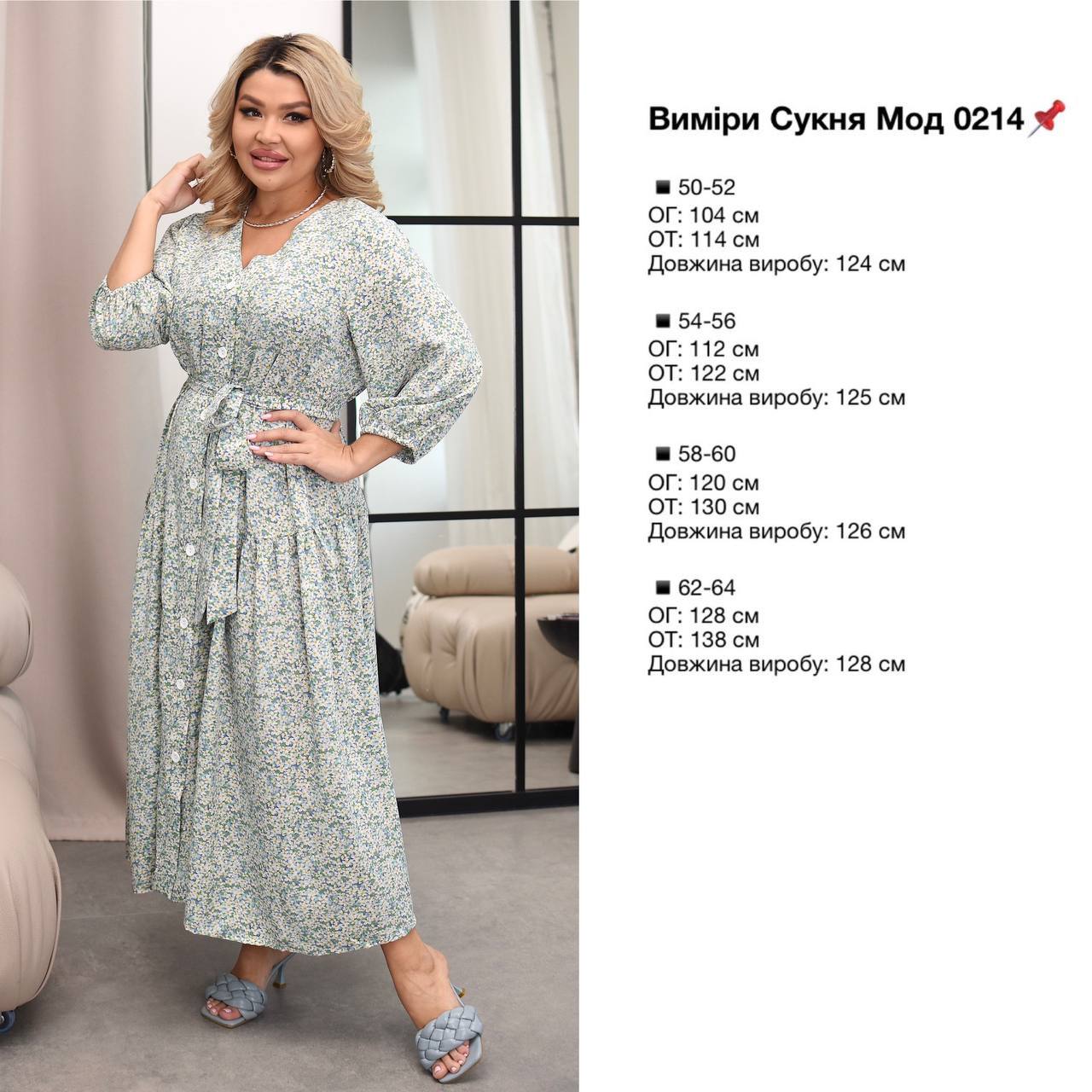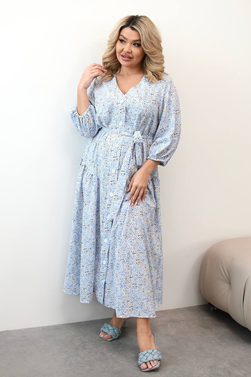 Це плаття — витончене та дуже жіночне, з легким романтичним настроєм. Воно виконане з легкої тканини з дрібним квітковим принтом. Силует вільний, подовжений (довжина міді), з акцентом на талії за допомогою тканинного пояса.
