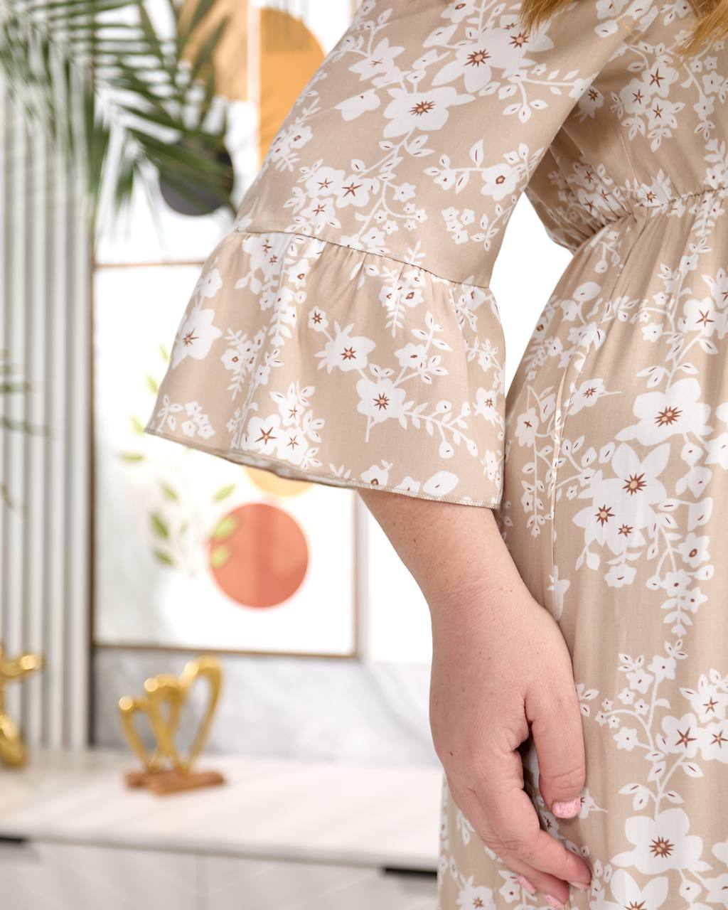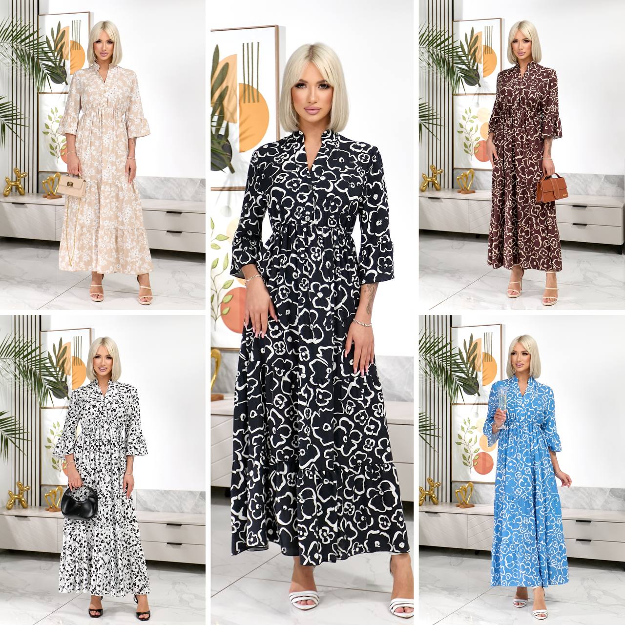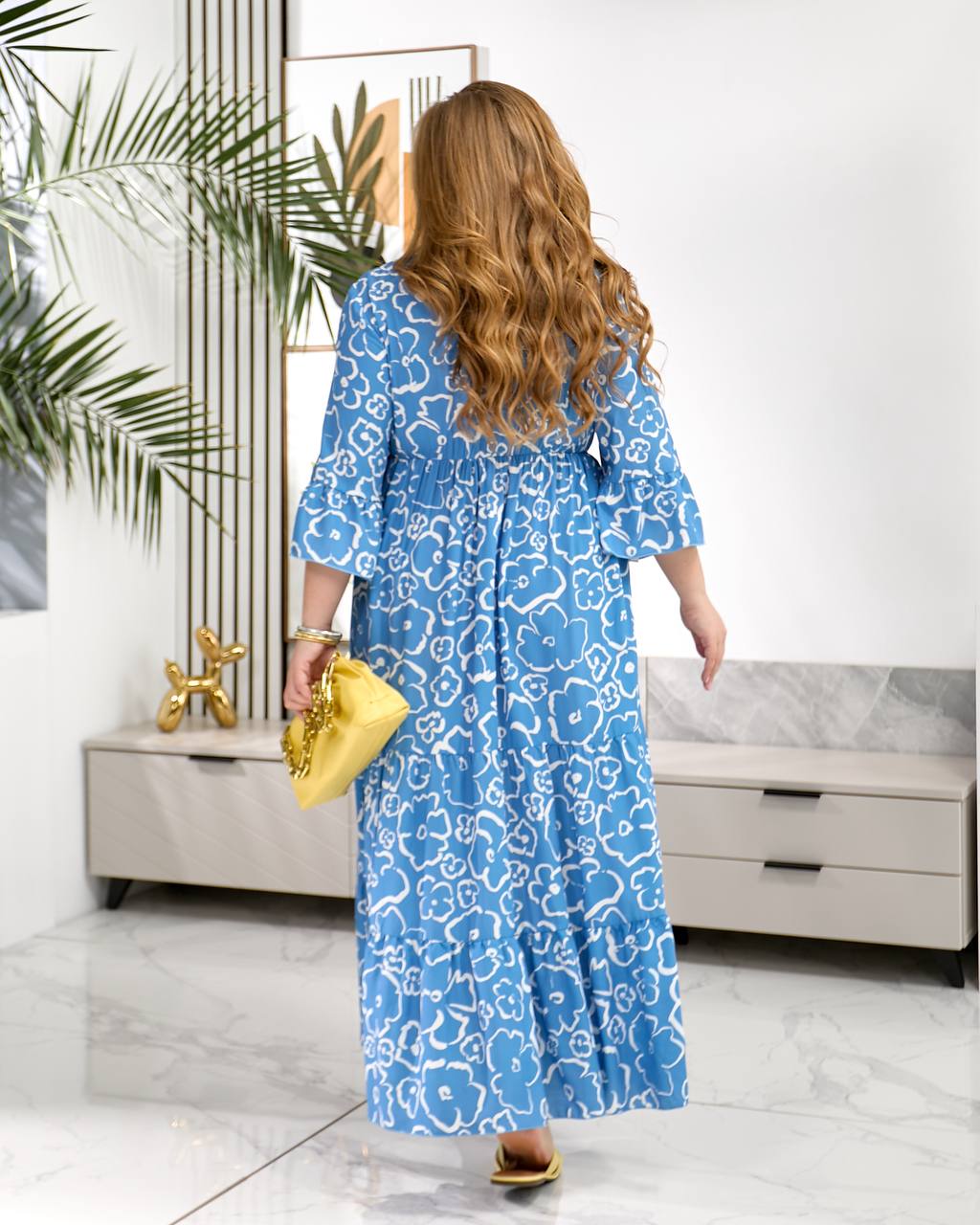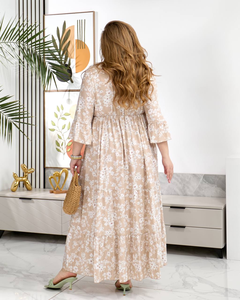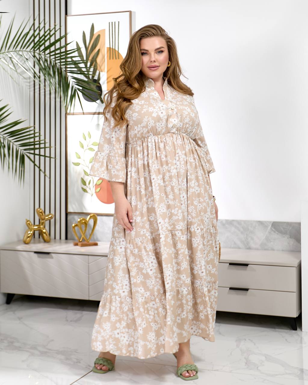 Модель виконана з м’якої, дихаючої тканини, яка приємна до тіла та дарує комфорт навіть у спекотні дні. Сукня має вільний крій, що красиво лягає по фігурі та не сковує рухів. Завдяки легкому драпіруванню створюється витончений, струмливий силует. Ґудзики робочі