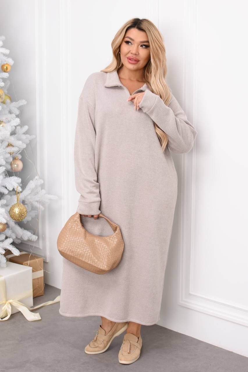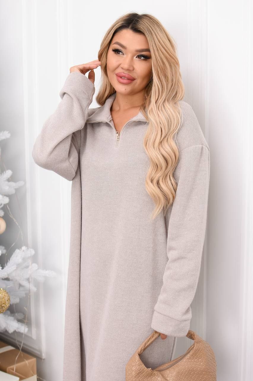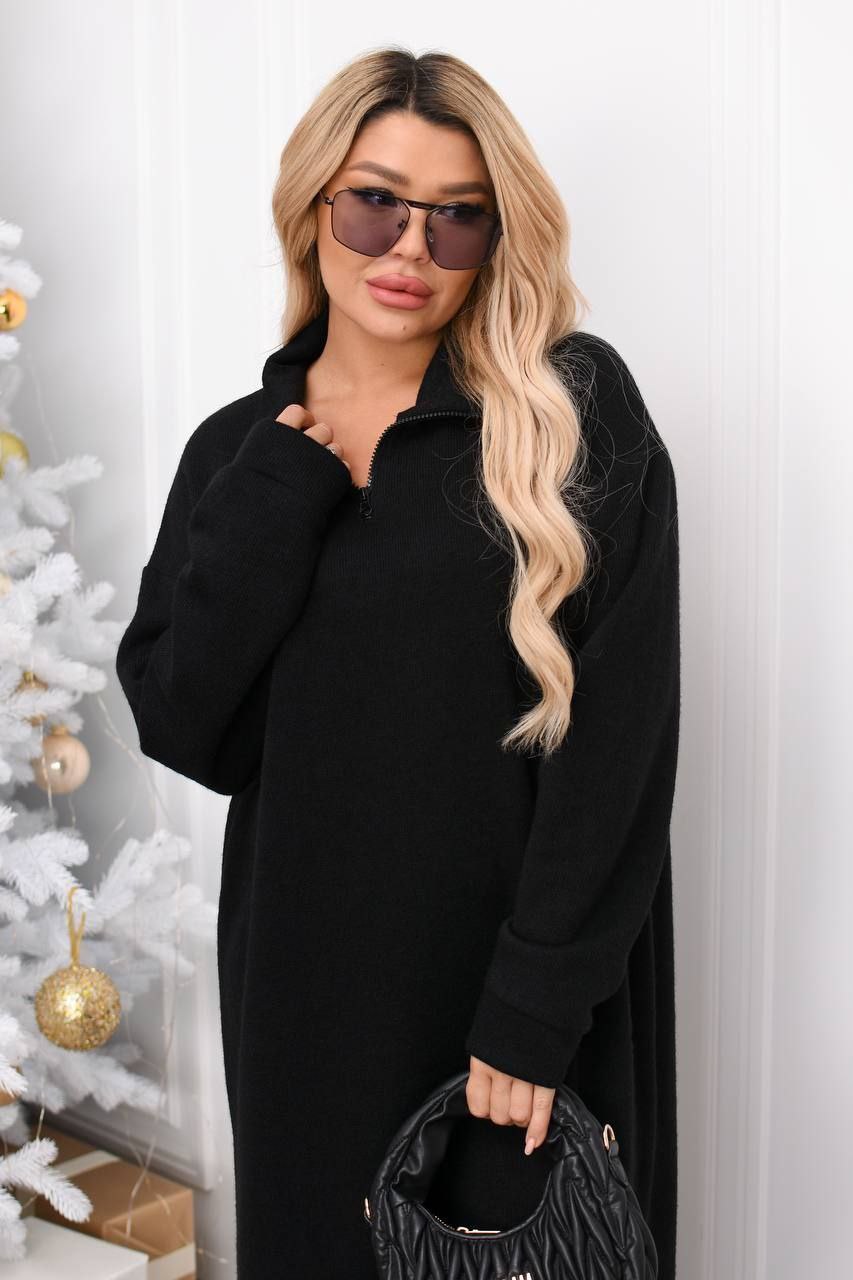 Модель № 771. Тепла прогулянкова сукня. Сукня, довжина нижче коліна, з довгим рукавом, комір стояка, попереду змійка. Тканина італійська в’язка, дуже приємна до тіла, тканина трохи тягнеться. Колір: Чорний, Слонова кістка. Розміри 50-52, 54-56, 58-60.