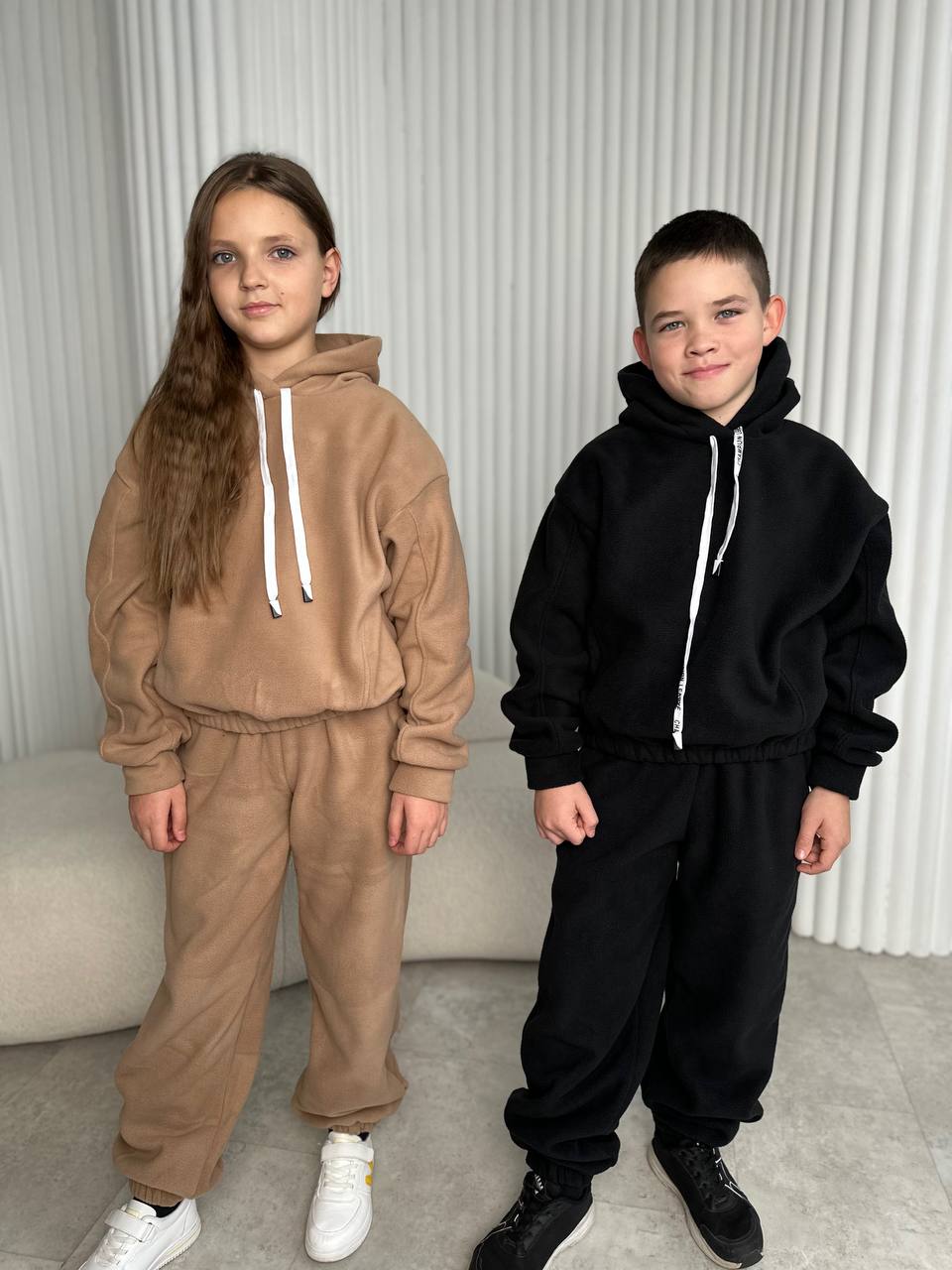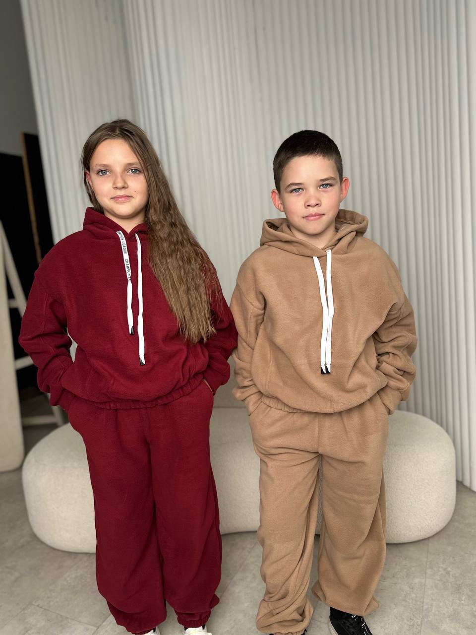 У комплекті батник з капюшоном і штани-джогери на м’якій резинці, з боків кишені. М’який, теплий і легкий, комфортний для прогулянок, садочку та школи. Фліс приємний до тіла, швидко сохне і добре тримає тепло. Оверсайз сидить вільно і не сковує рухів. Модель унісекс — підходить і хлопчикам, і дівчаткам.