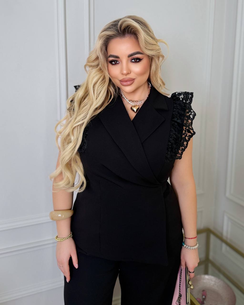 Елегантний жилет на запах красиво підкреслює талію, а мереживні рукави-крильця додають образу легкості та жіночності.