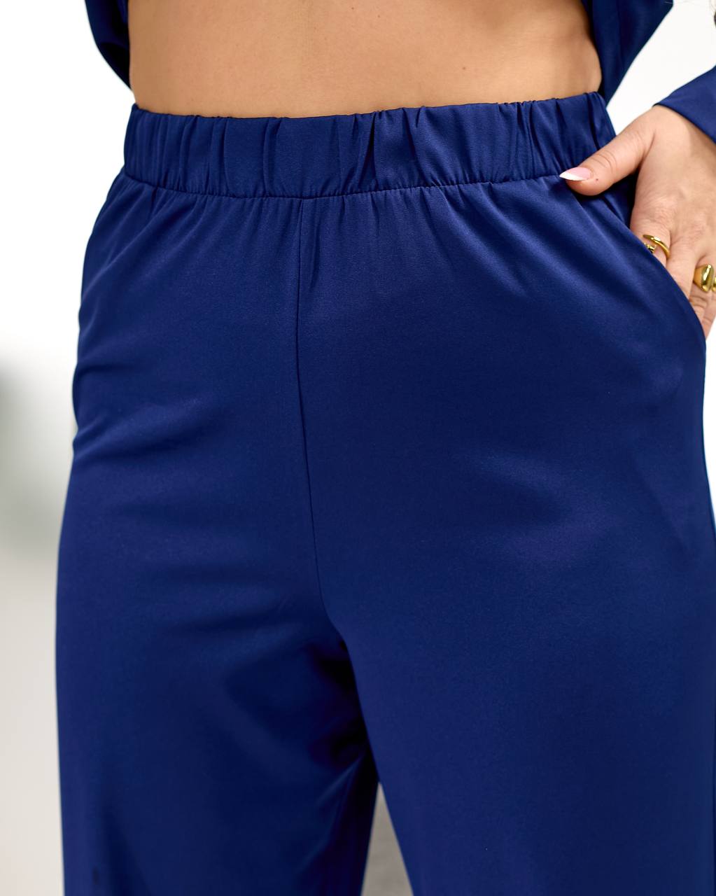 Жіночий костюм, що складається з блузи на блискавці та широких штанів.