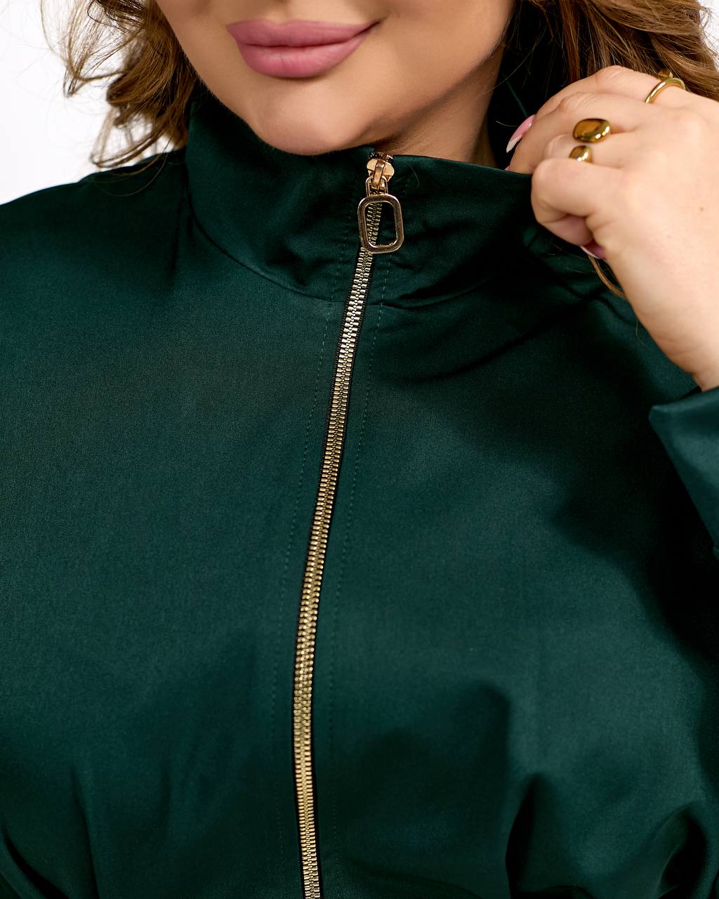 Комір: стійка (можливість носіння у відкритому та закритому вигляді).Пояс: знімний, із декоративною золотистою пряжкою, регулює посадку по талії і змінює настрій образу.
