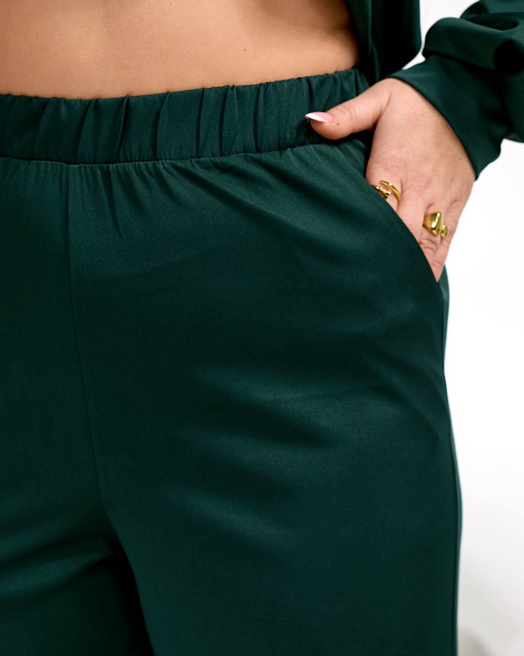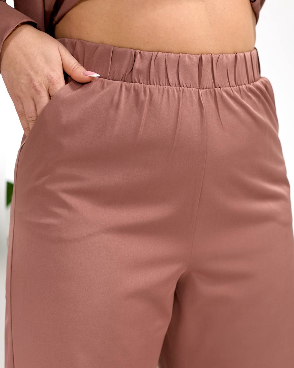 Штани вільного крою прямі, посадка висока, в поясі на гумці, з кишенями.