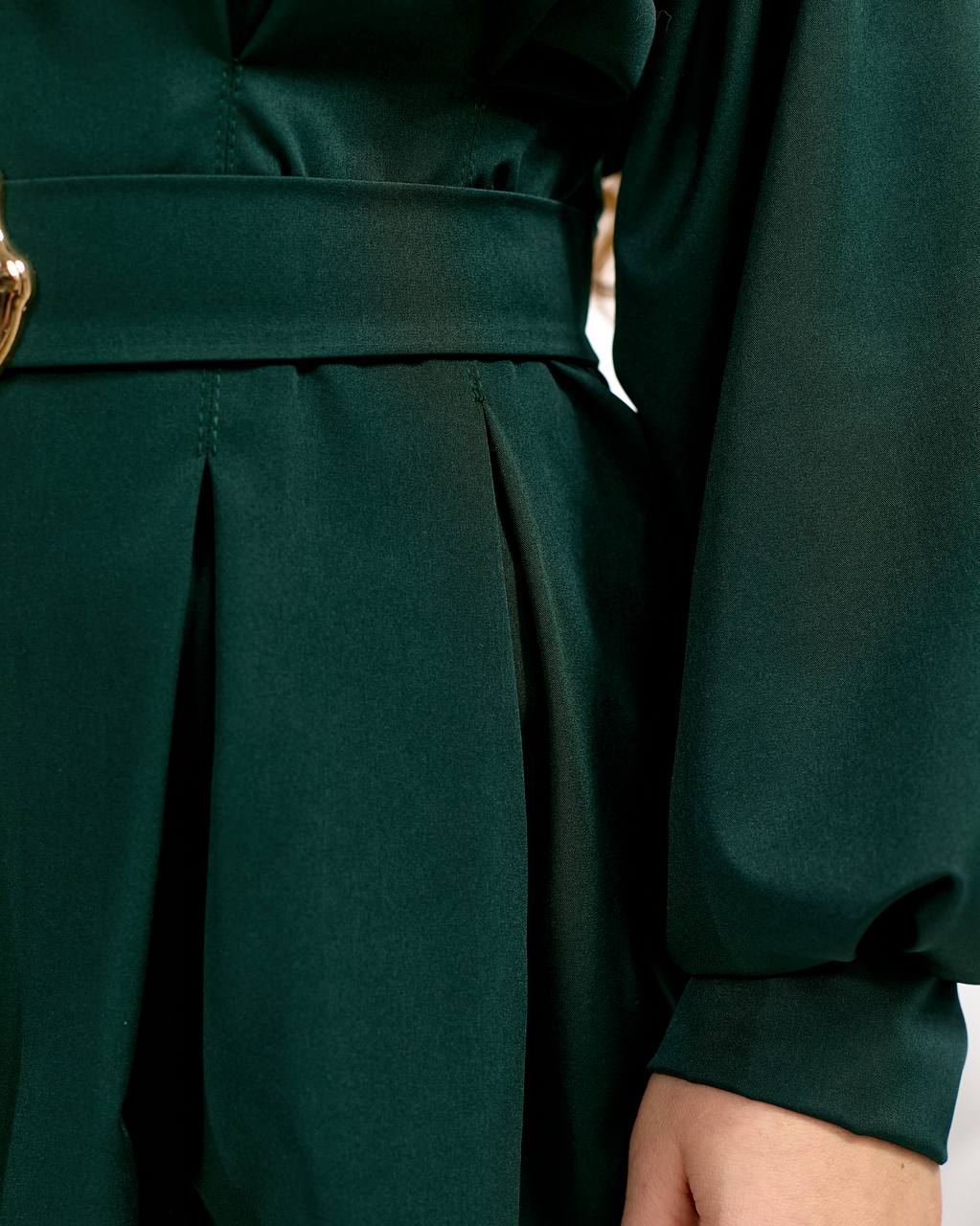 Блуза напівприталеного силуету,спереду і по спинці на талії з мʼякими складками , що формують ефектну баску. Спереду- золотиста застібка блискавка. Рукав: довгий, об’ємний , низ рукава зібраний на манжету.