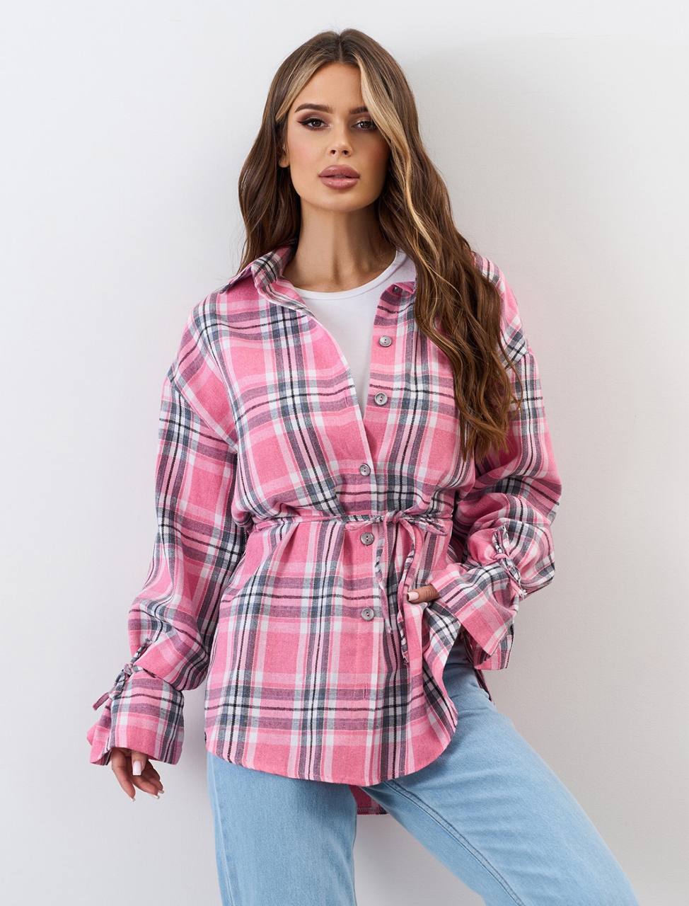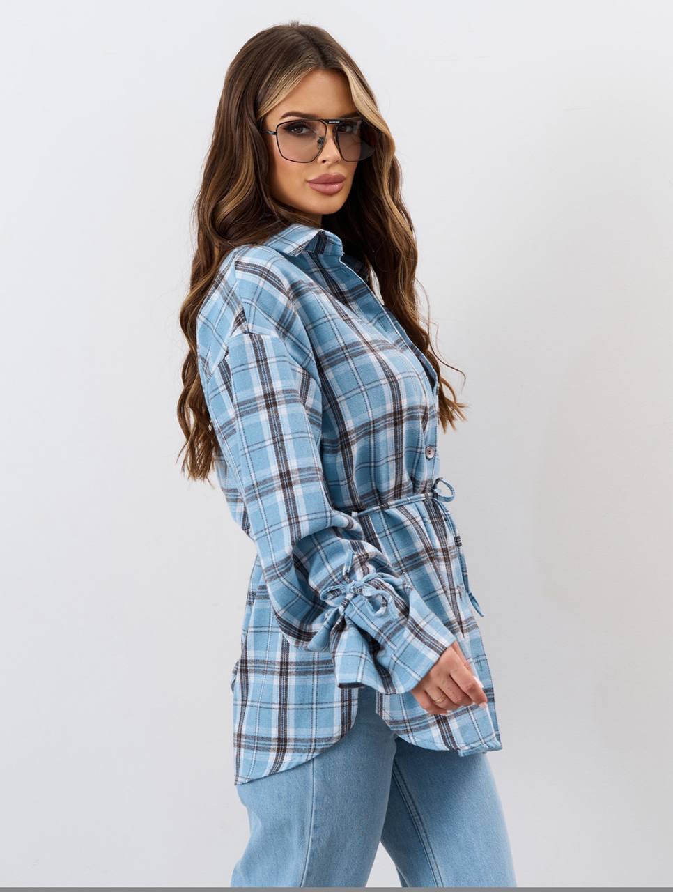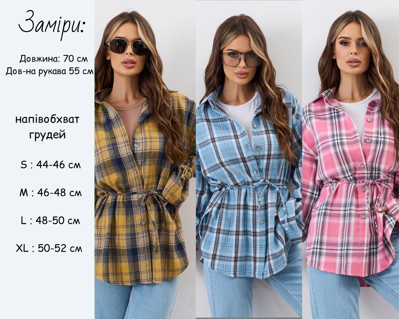 Опис: Сорочка вільного крою на ґудзиках з м’якої бавовняної фланелі , оригінальні рукава з завʼязками та паском.