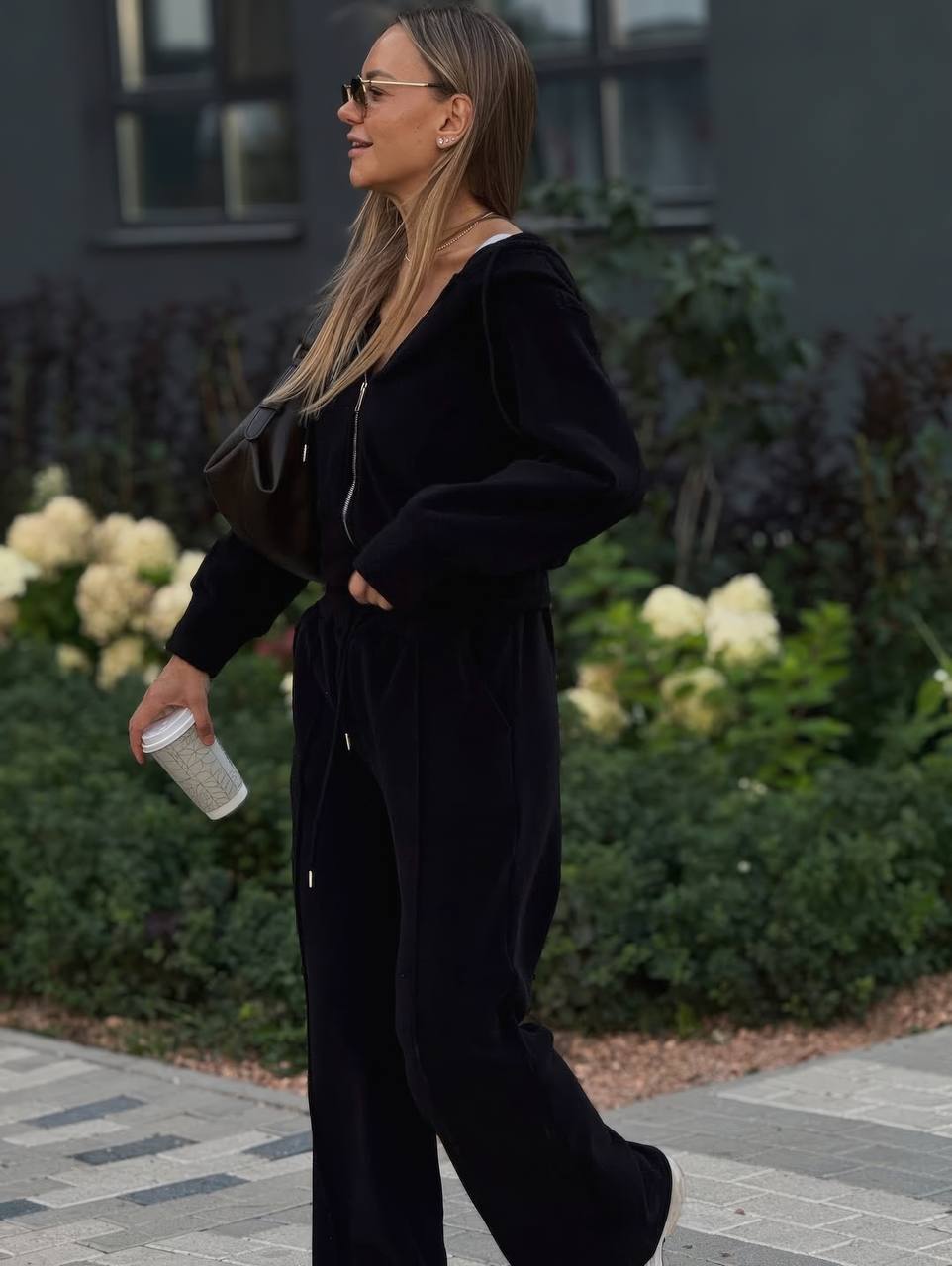 Ідеальна посадка, блискавка на худі й продуманий крій штанів створюють сучасний лук.