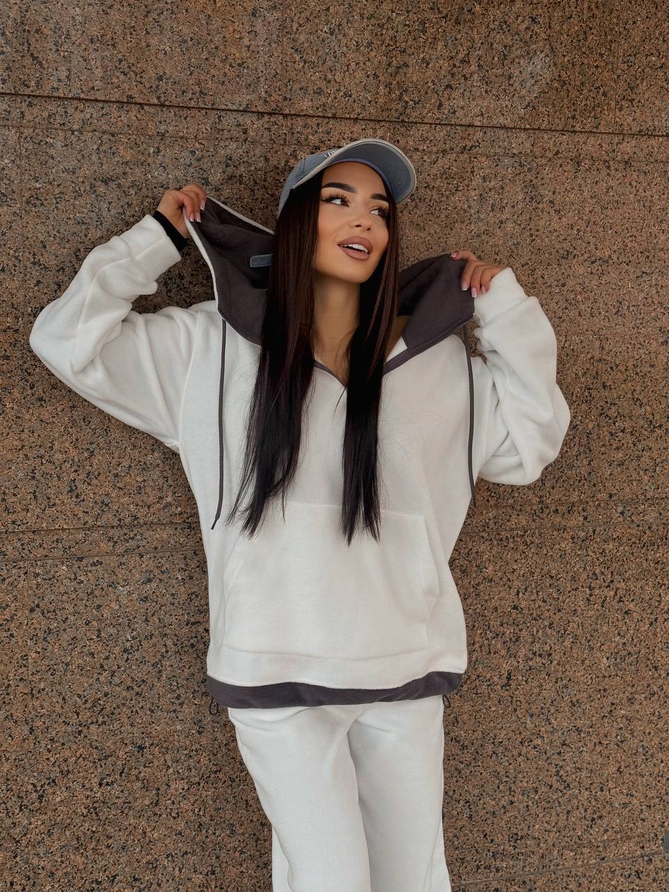 Худі має великий подвійний капюшоном з високою стійкою , є карман-кенгуру , по низу худі на кулісці .