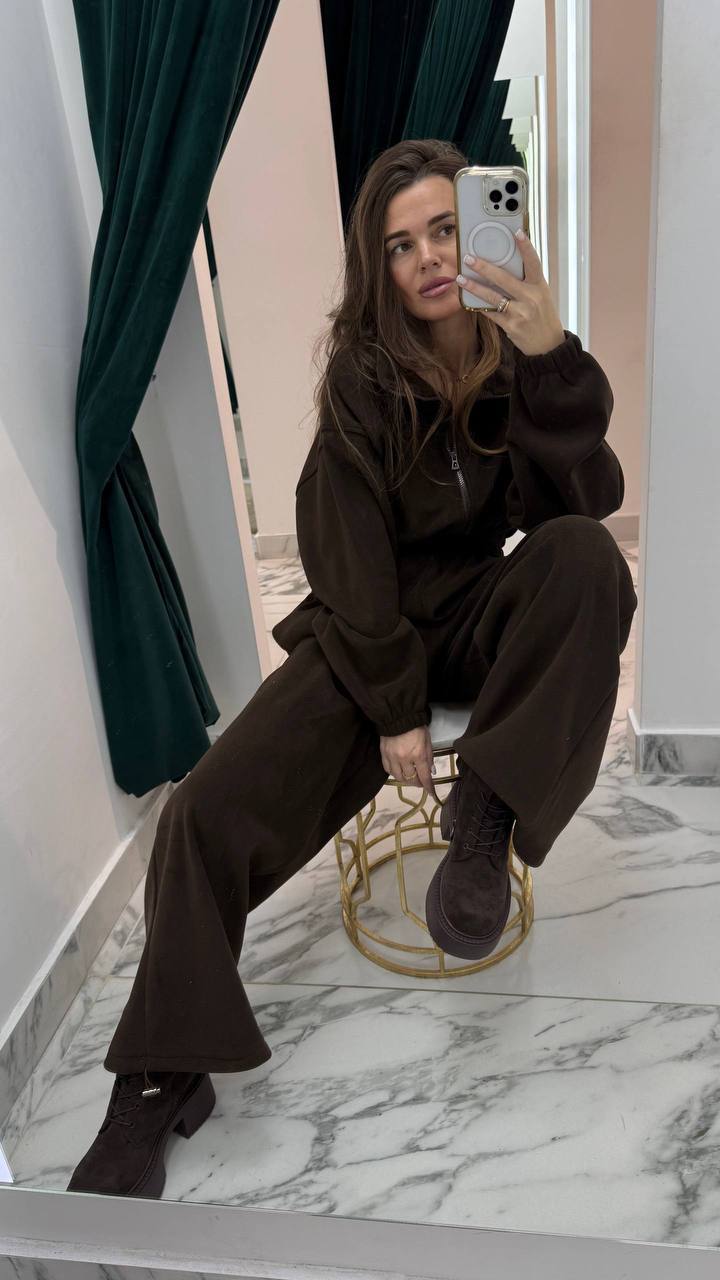 верх на замку, акуратно виділена талія та прямі штани з куліскою по низу, неймовірно теплий та зручний