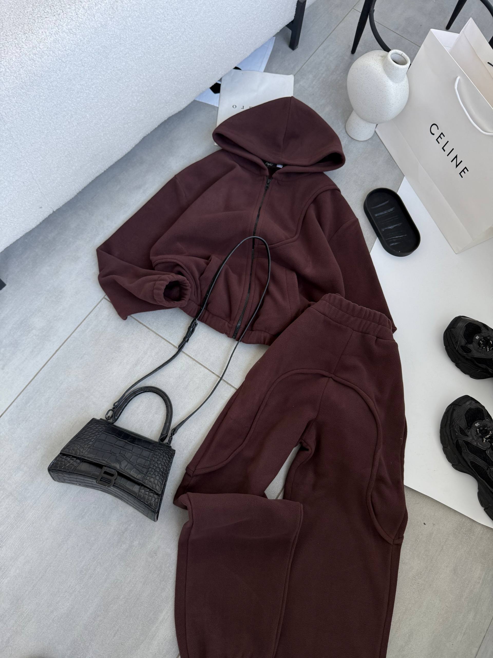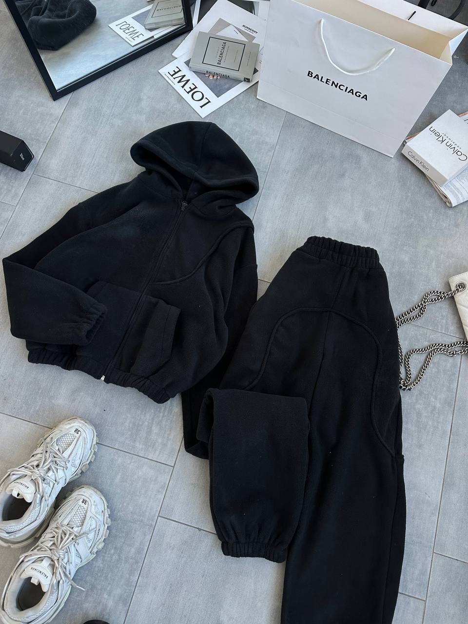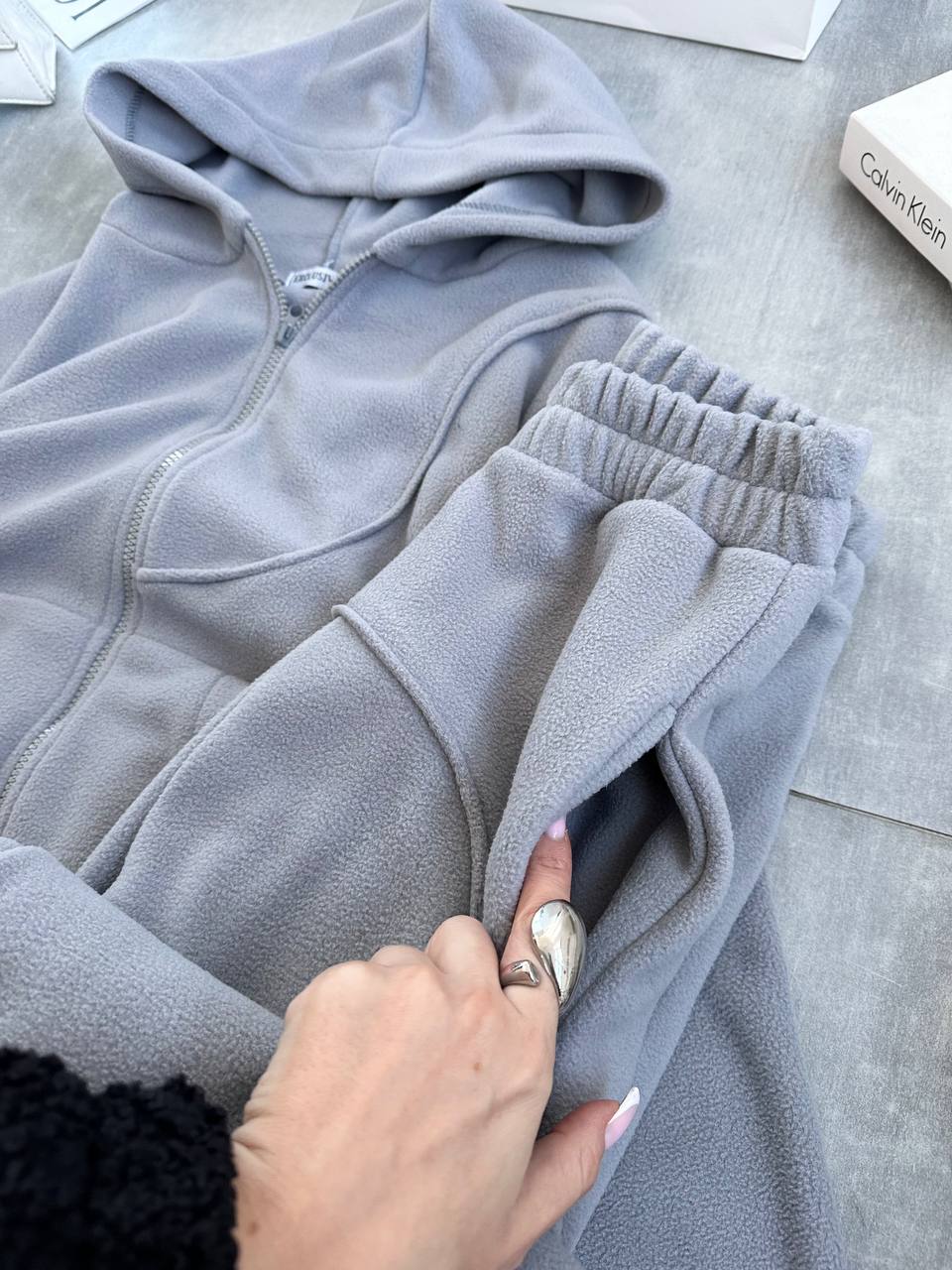 Дуже зручний, теплий і водночас стильний флісовий костюм – джогери на високій посадці, з оригінальними перестрочками, худі на змійці, з капюшоном та перестрочками