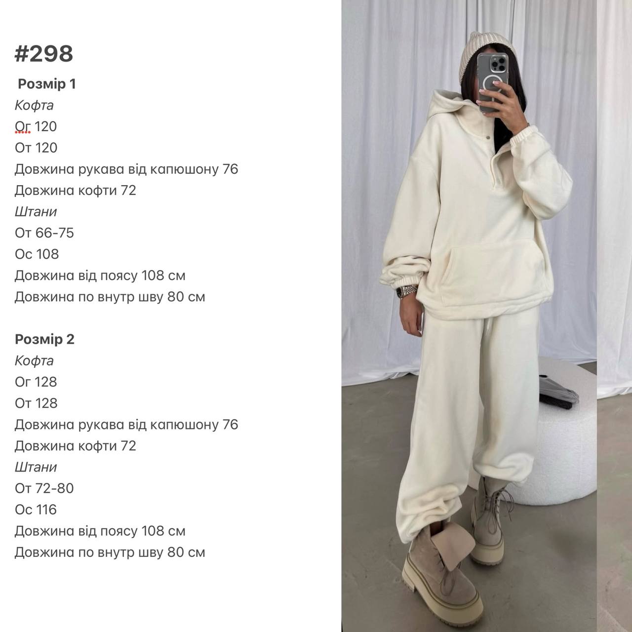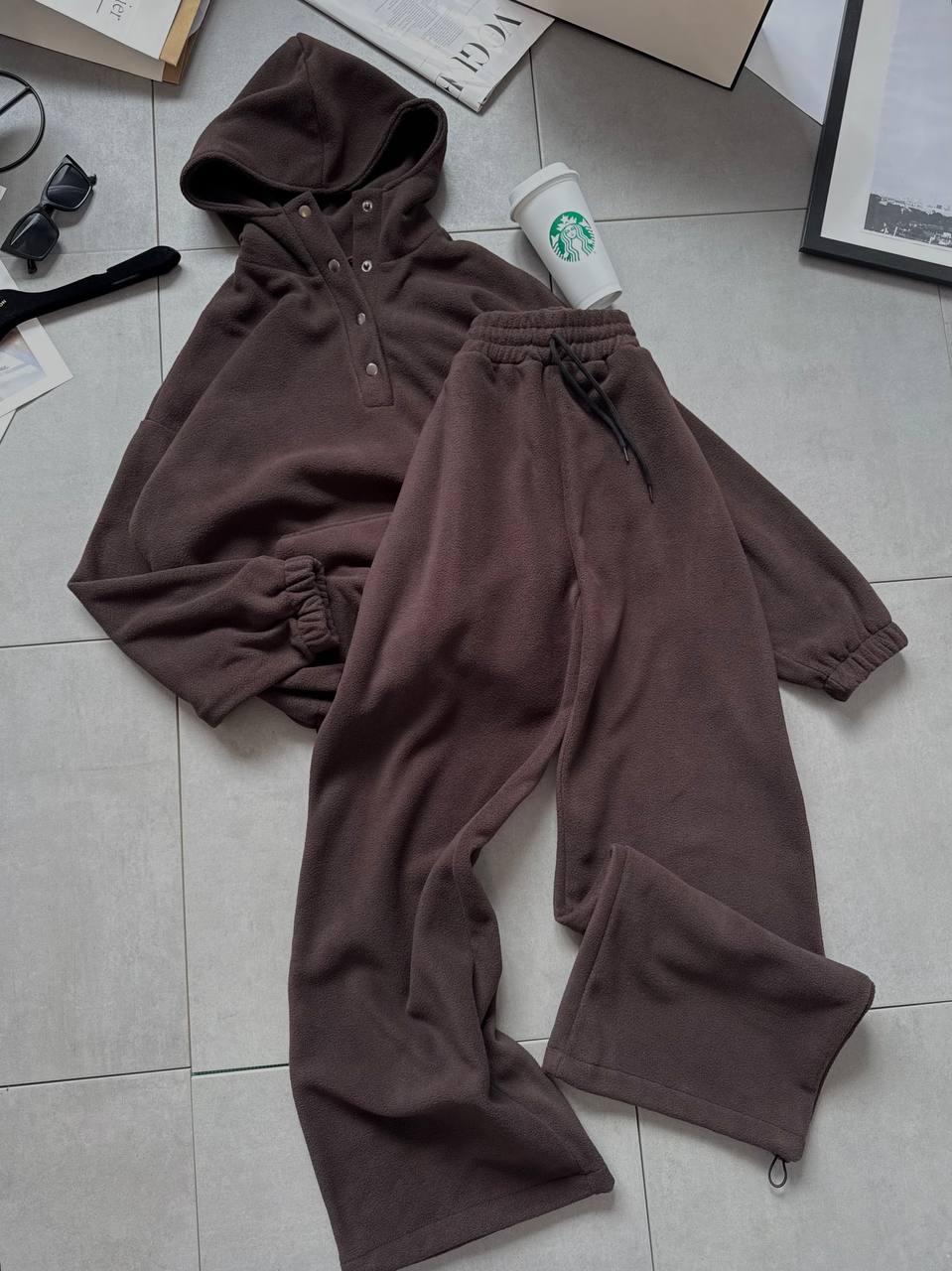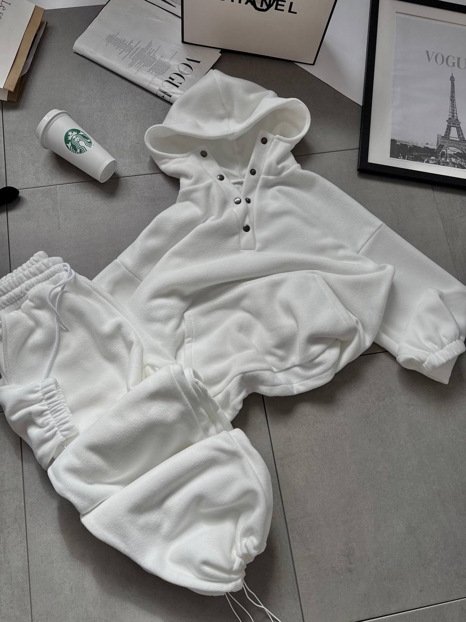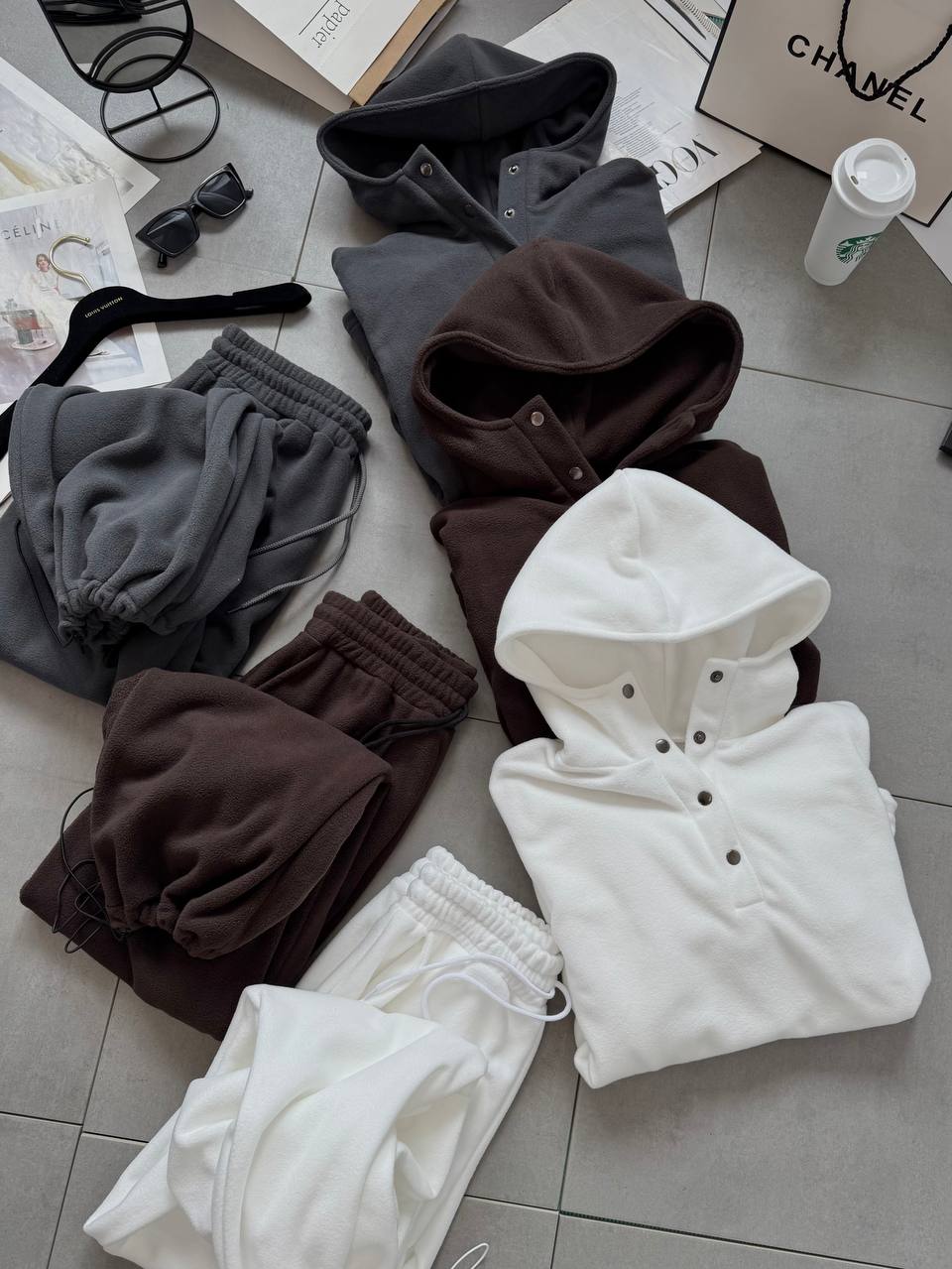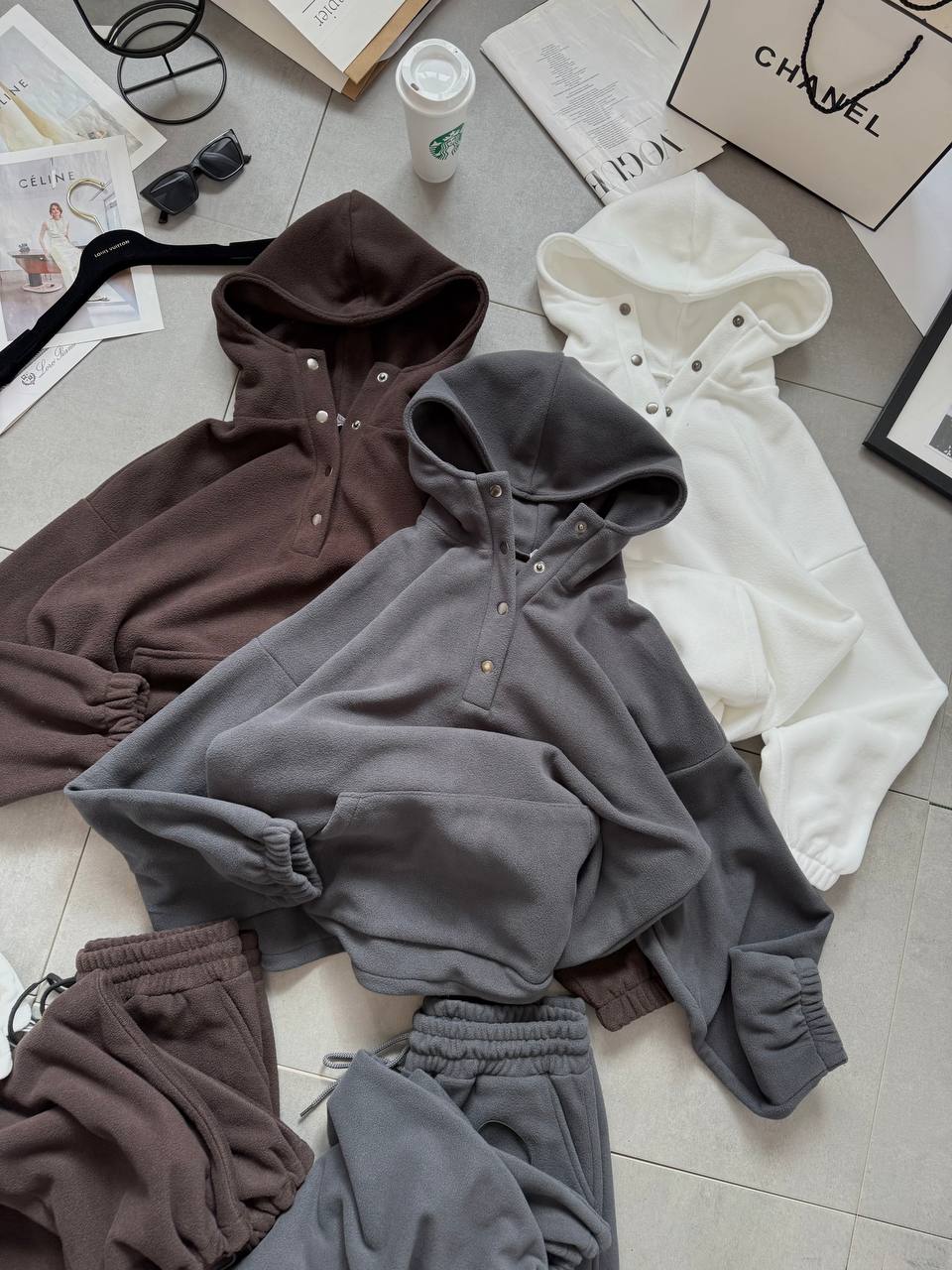 Капюшон подвійний , кофта по низу затягується , штанці на високій посадці вільного крою і також по низу регулюється ширина за рахунок резинок