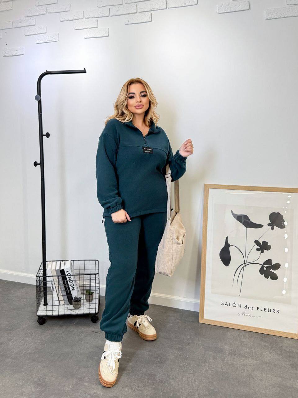 Тканина мʼяка та приємна на дотик, кофта застібається на блискавку, комірець напів стійка, знизу на резинці та регулюється стопорами з боків, штани з кишенями, пояс на резинці 5 см зроблений на спецмашині, знизу штанів резинка 3см