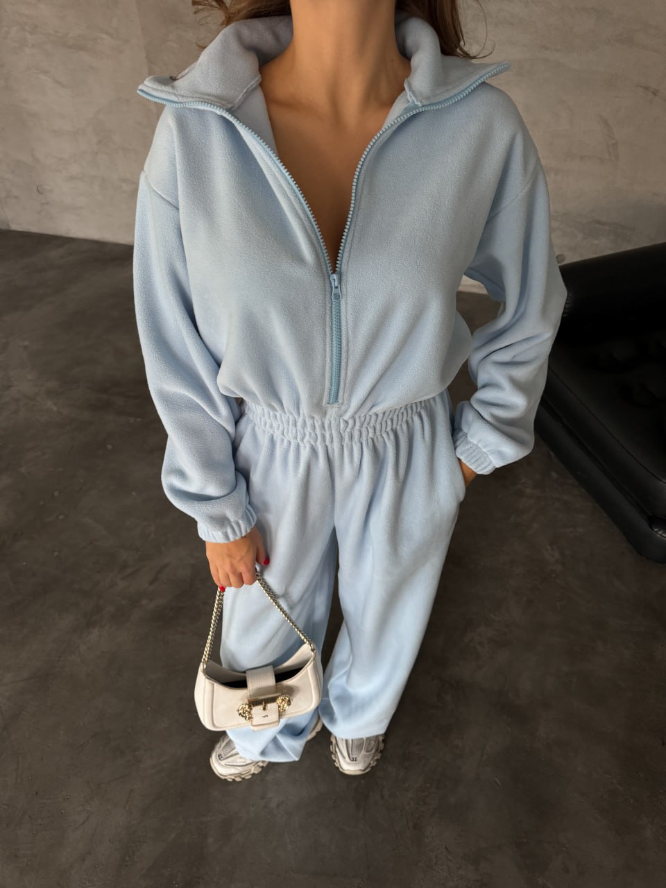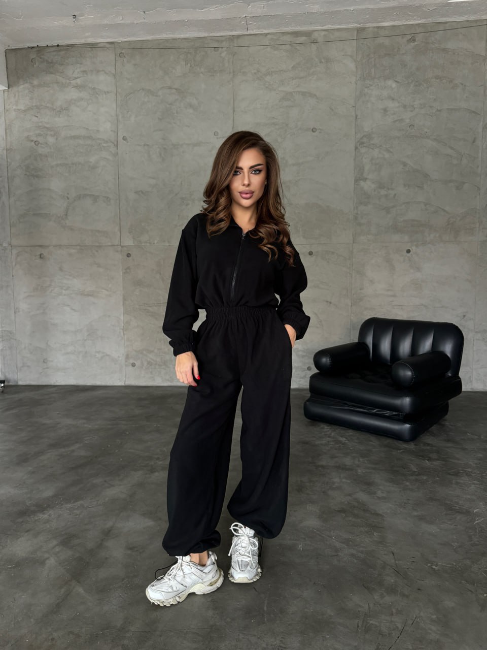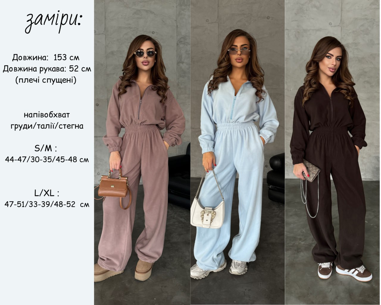 Опис: Стильний та універсальний комбінезон з м’якого і теплого флісу- просто створений для максимального комфорту . Модель застібається на блискавку, у поясі резинка, брюки прямого крою з гумкою замість манжетів.( можна затягувати )