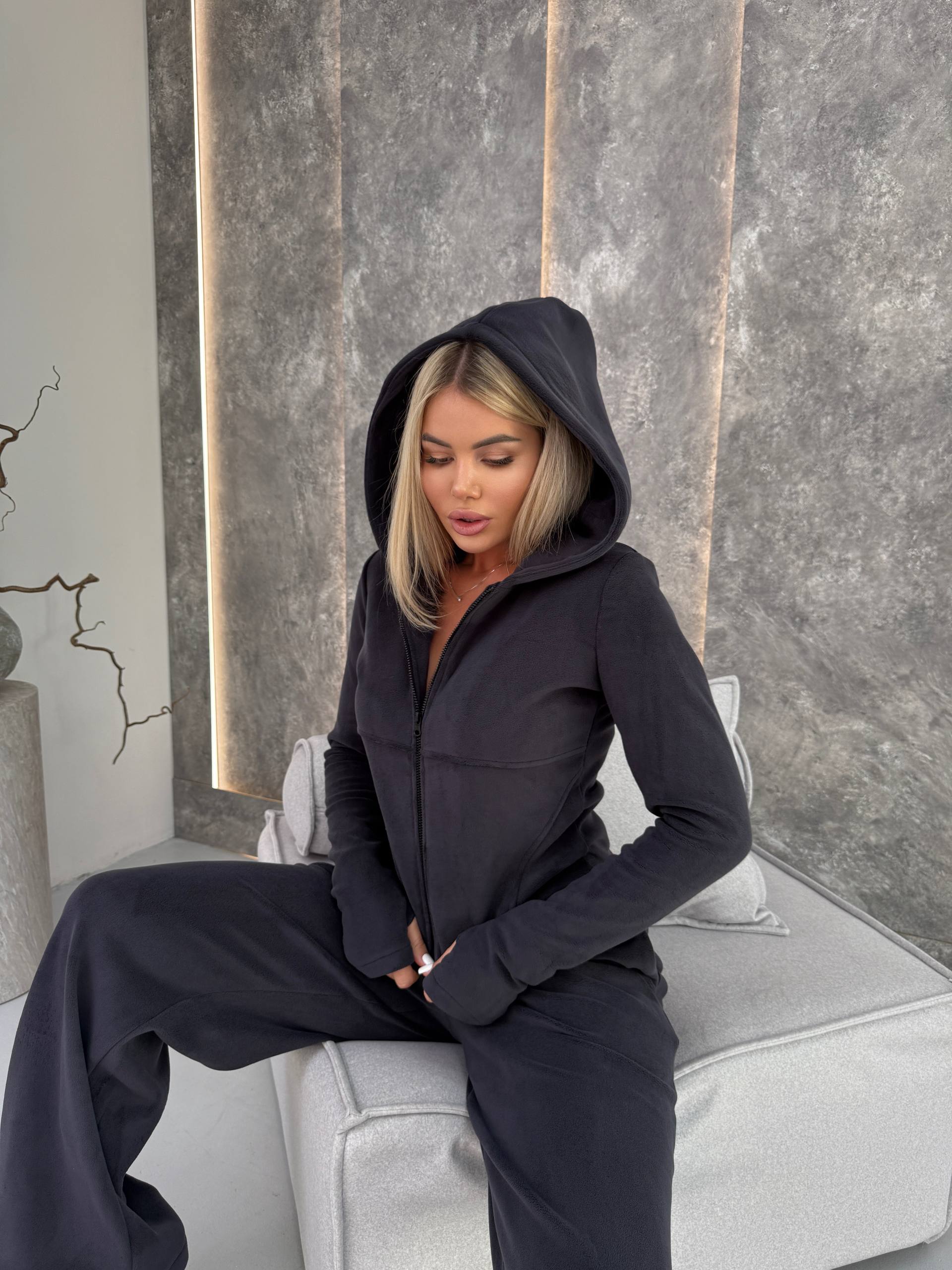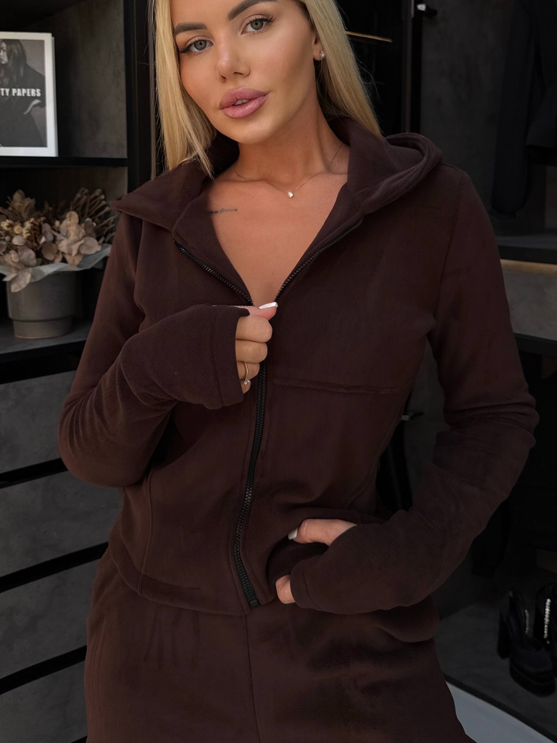 Флісовий костюм-двійка з ідеальним пошивом. Його дуже зручно одягати під верніх одяг, так як кофта не є обʼємною. Також є капюшон. На рукавах прорізи на пальчик.