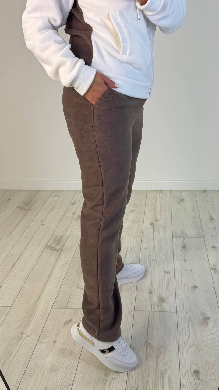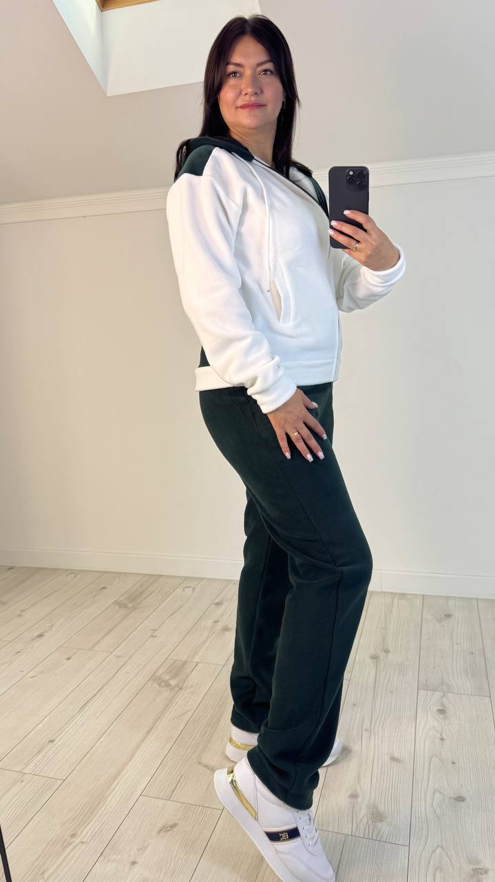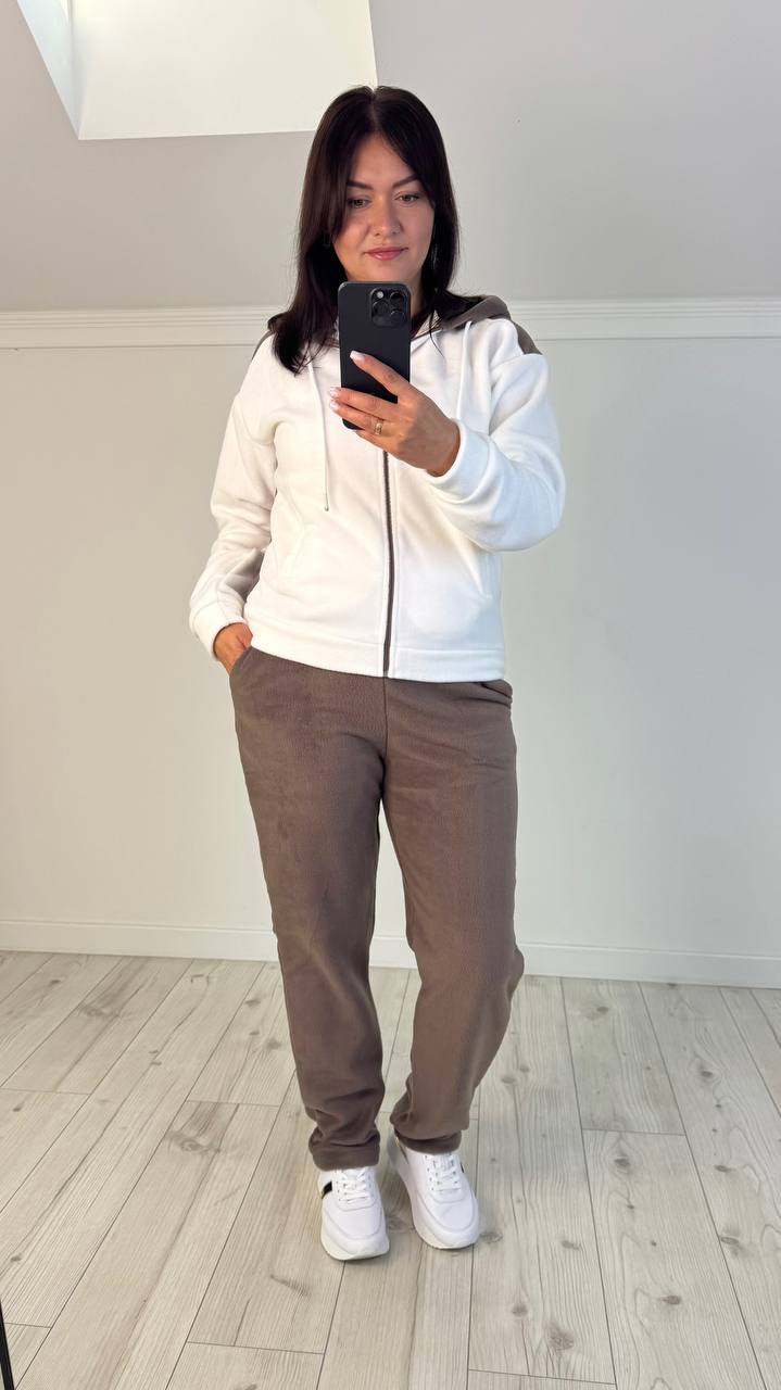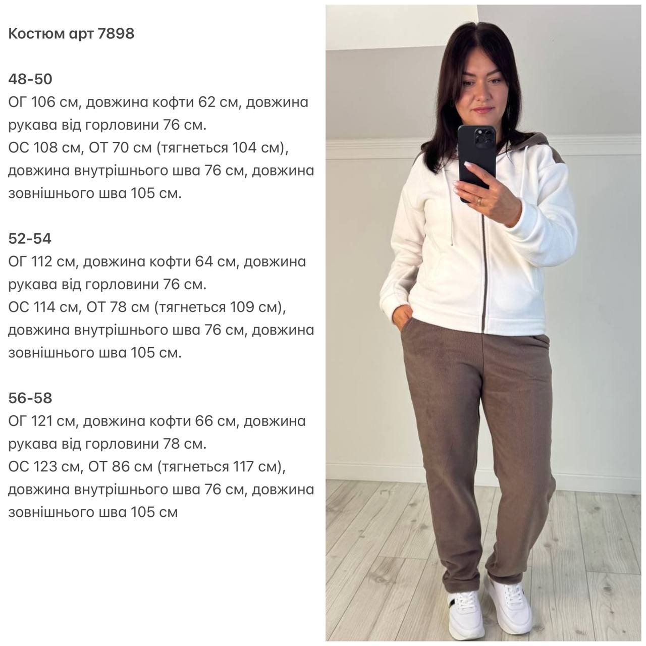 Костюм спортивний штани та кофта. Кофта із капюшоном,на блискавці, рукава на манжетах, з двома карманами. Штани прямого крою до низу, посадка висока, талія на резинці, із кишенями. Дуже теплий, тканина мʼягенька та щільна