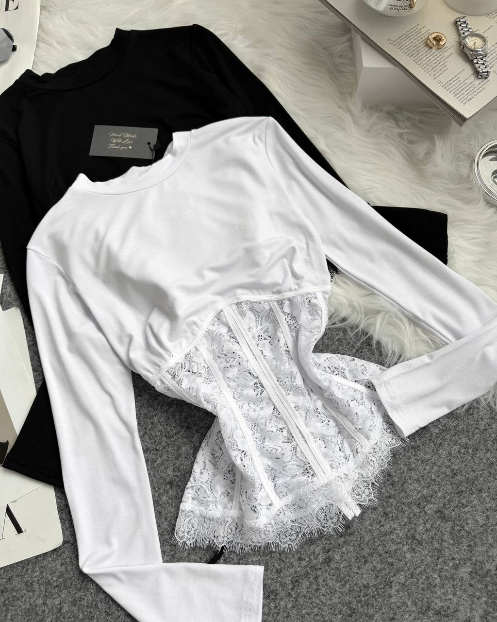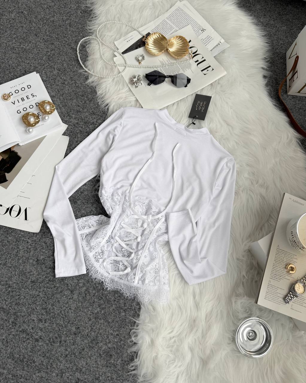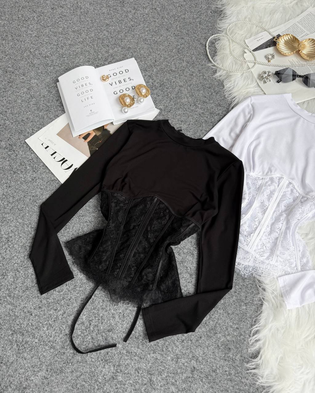 Витончена кофтинка з мереживом, з імітацією корсету. Тканина приємна до тіла, трохи тягнеться та сідає по фігурі.