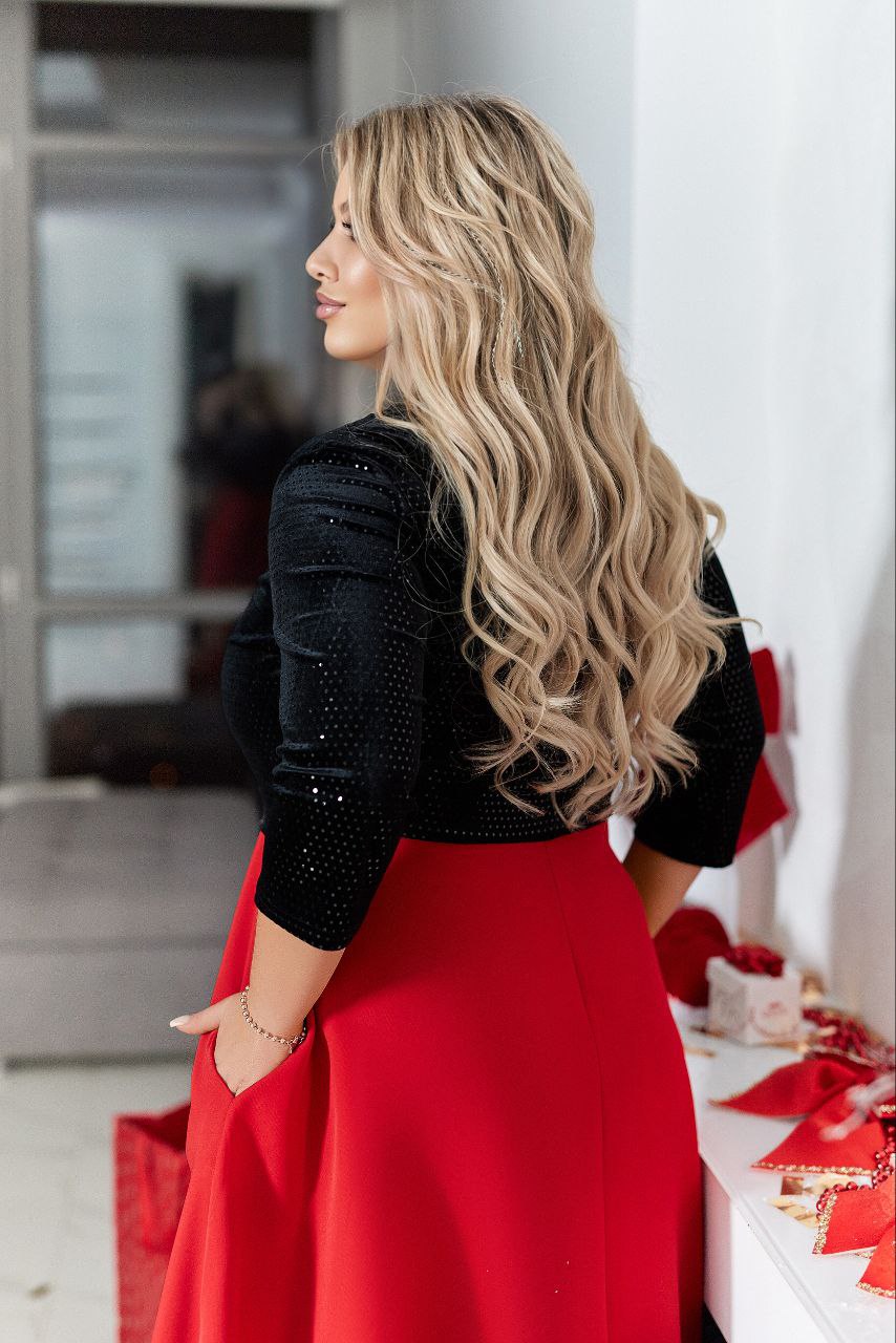 ■ Модель цільнокроєна, поєднує розкіш велюру-бархату з впаяною паєткою у верхній частині та костюмку діагональ у спідниці.