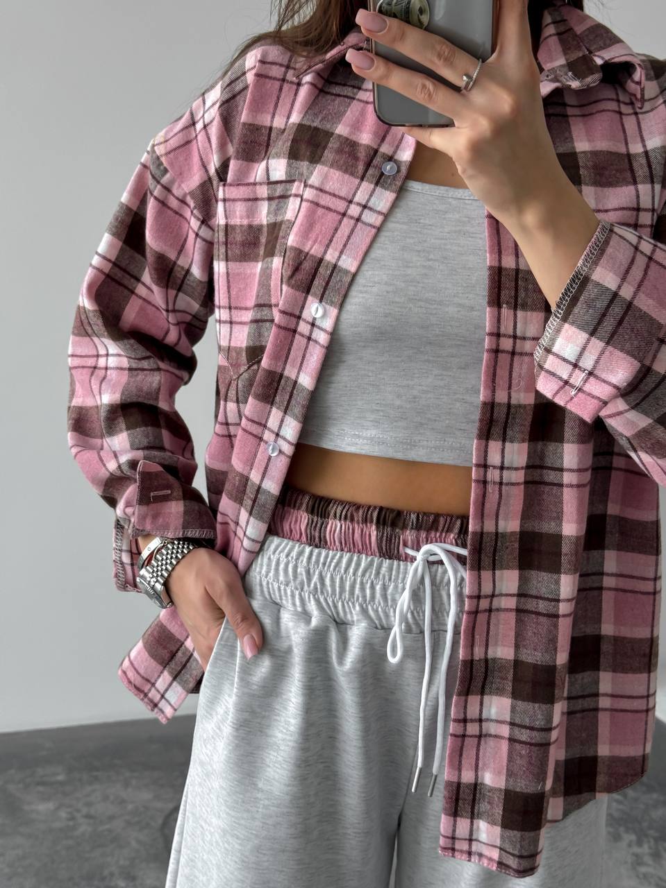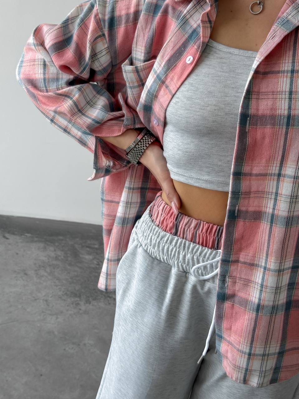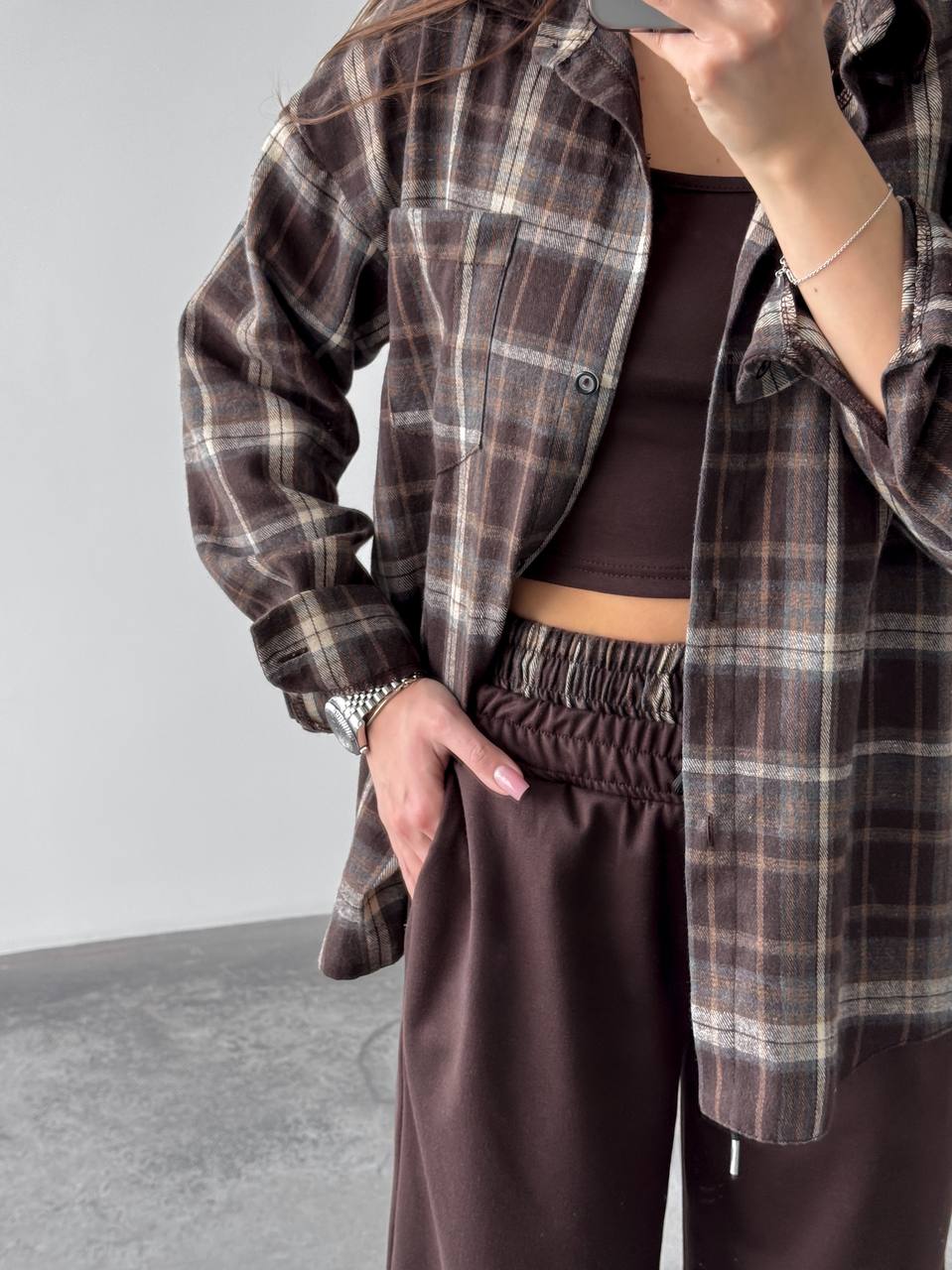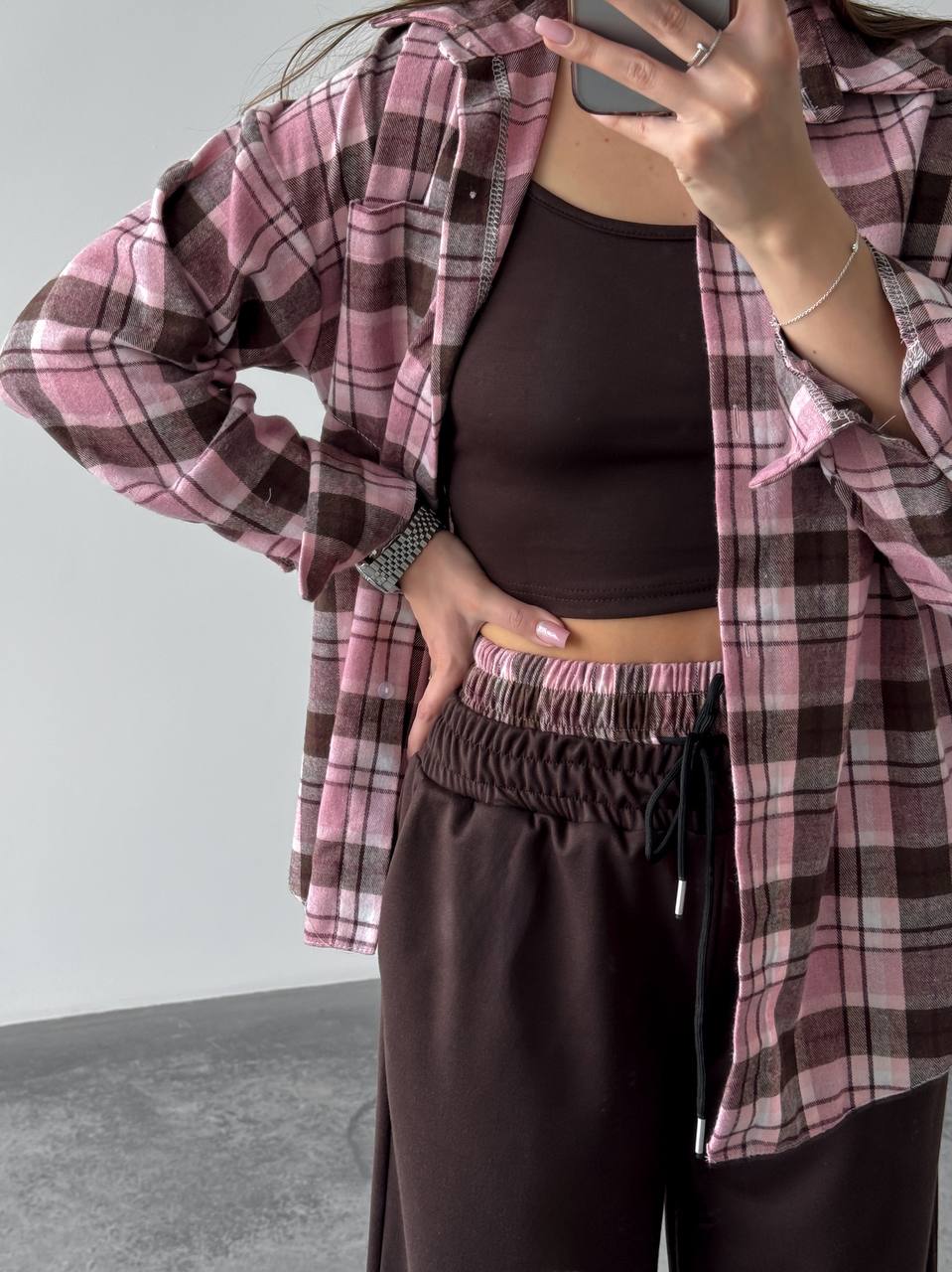 Жіночий костюм двійка у стильному та зручному виконанні: сорочка з м’якої фланелі, приємної до тіла. Брюки з двонитки — практичні та комфортні, з регульованим низом на фіксаторах для зручної посадки. Модель доповнена подвійним поясом, який підкреслює талію та додає образу завершеності.
