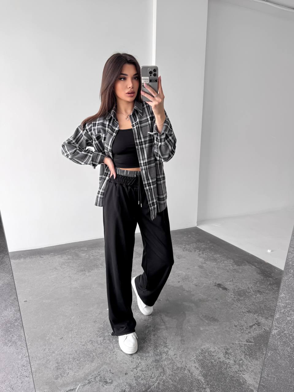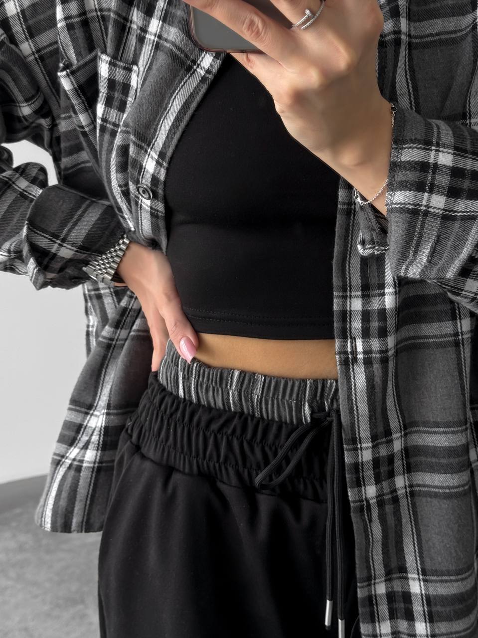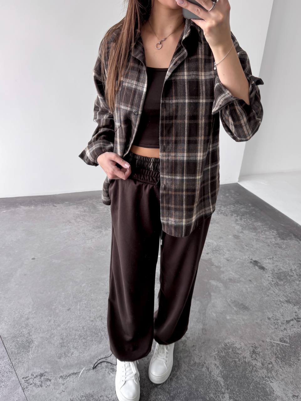 Жіночий костюм двійка у стильному та зручному виконанні: сорочка з м’якої фланелі, приємної до тіла. Брюки з двонитки — практичні та комфортні, з регульованим низом на фіксаторах для зручної посадки. Модель доповнена подвійним поясом, який підкреслює талію та додає образу завершеності.
