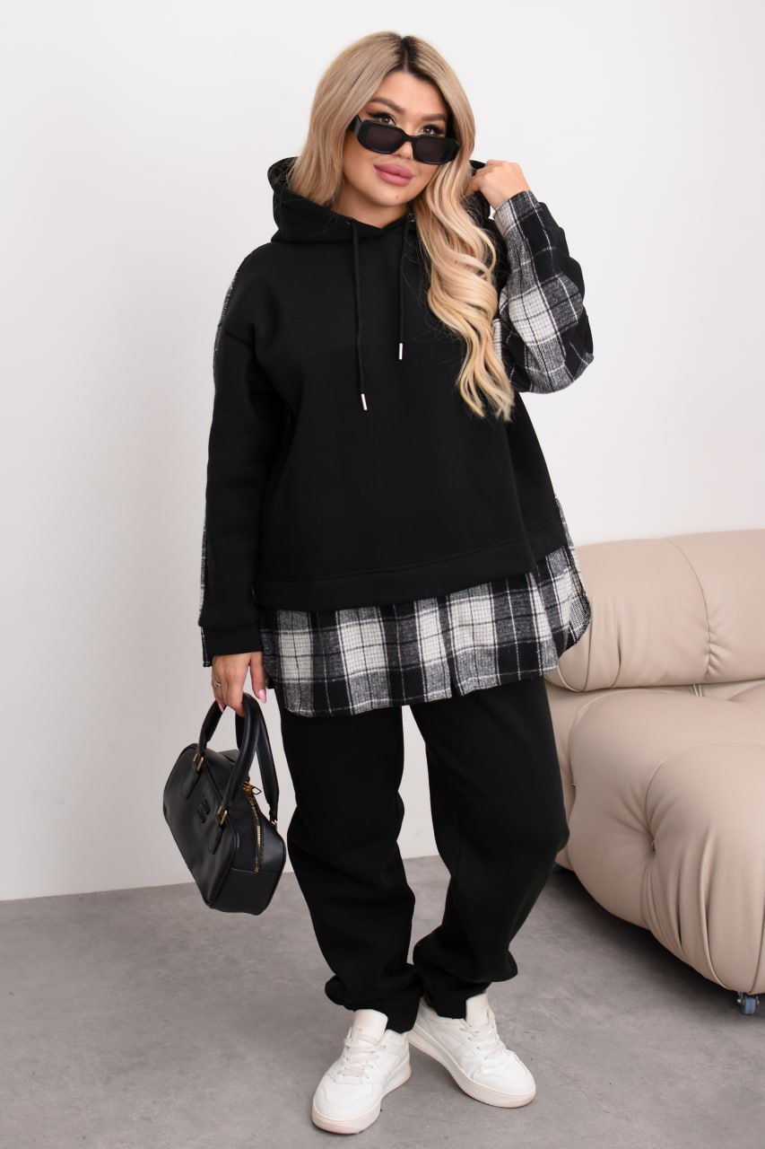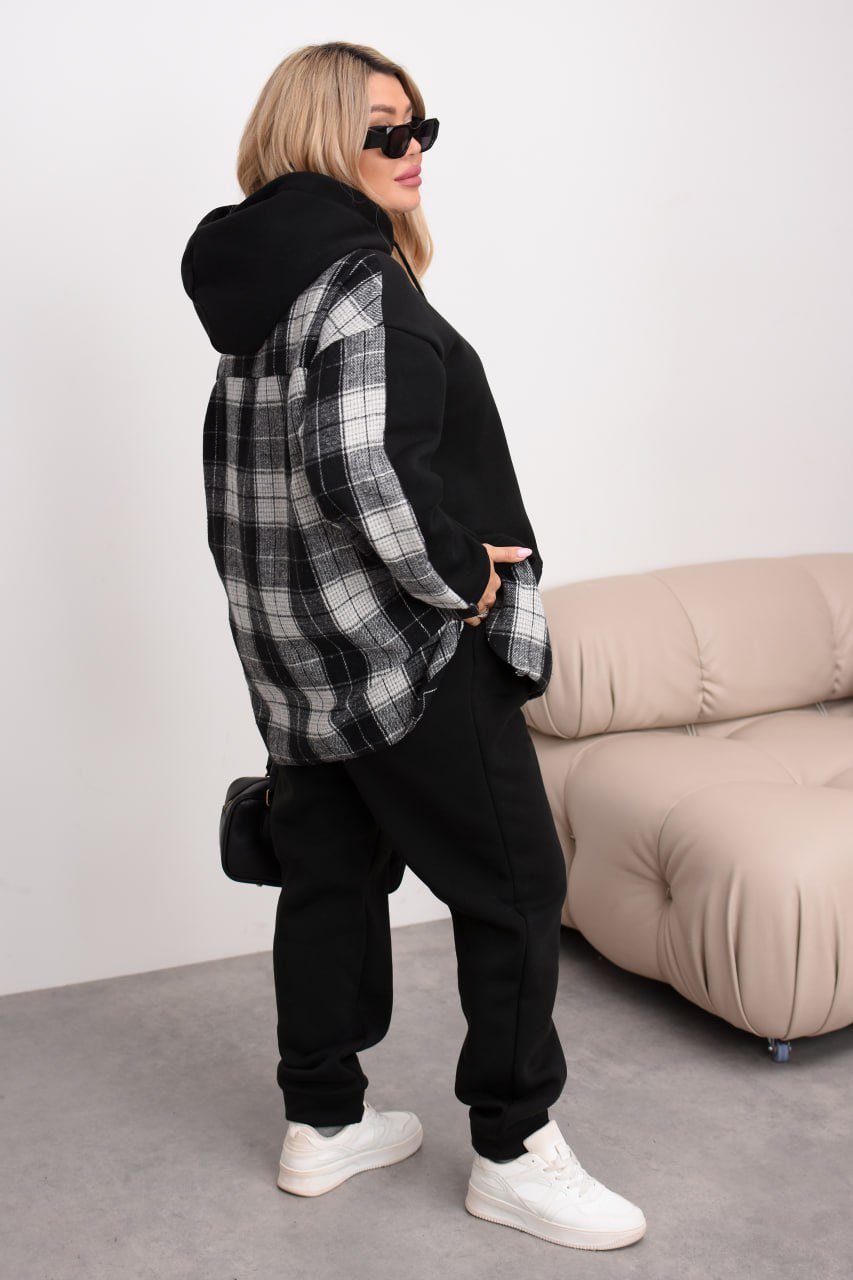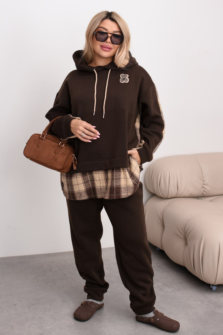 Комбінований теплий костюм із тринитки на флісі та байки в клітинку: штани середньої посадки на резинці з кишенями й оверсайз худі з капюшоном, розрізами з боків та трендовим декором «ведмедик». Ідеальний для затишних прогулянок та активних днів! ❄️